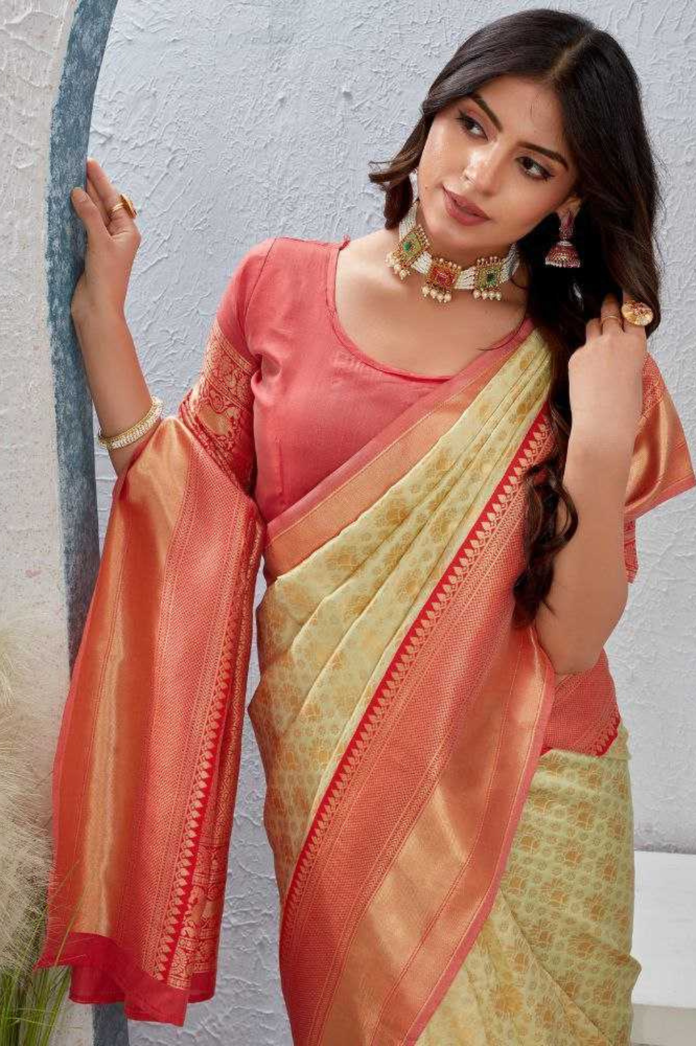 The saree’s soft texture and intricate woven detailing bring together tradition and sophistication — a true statement of grace and style.