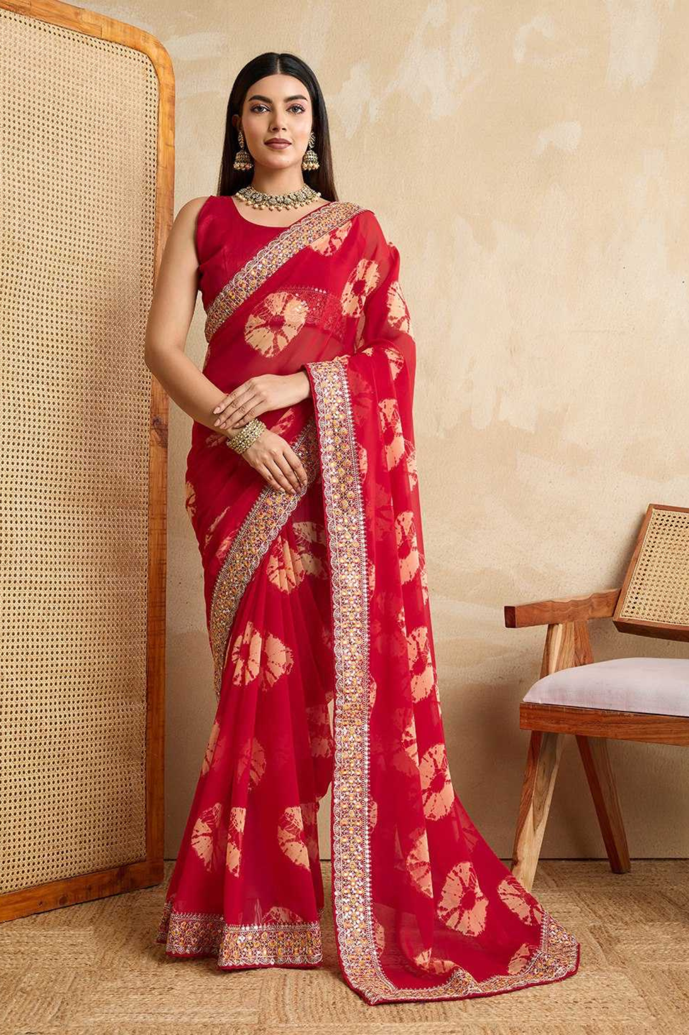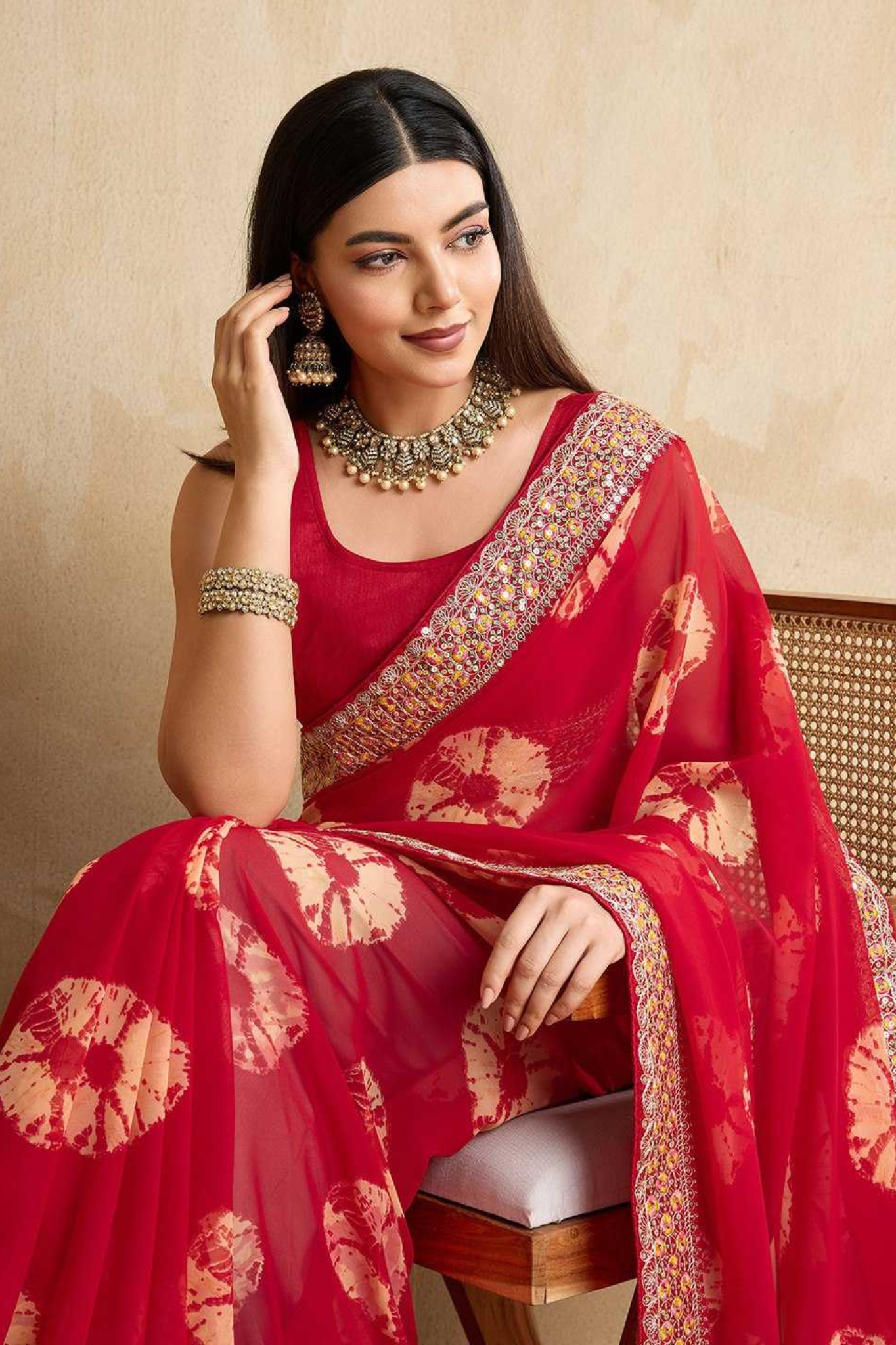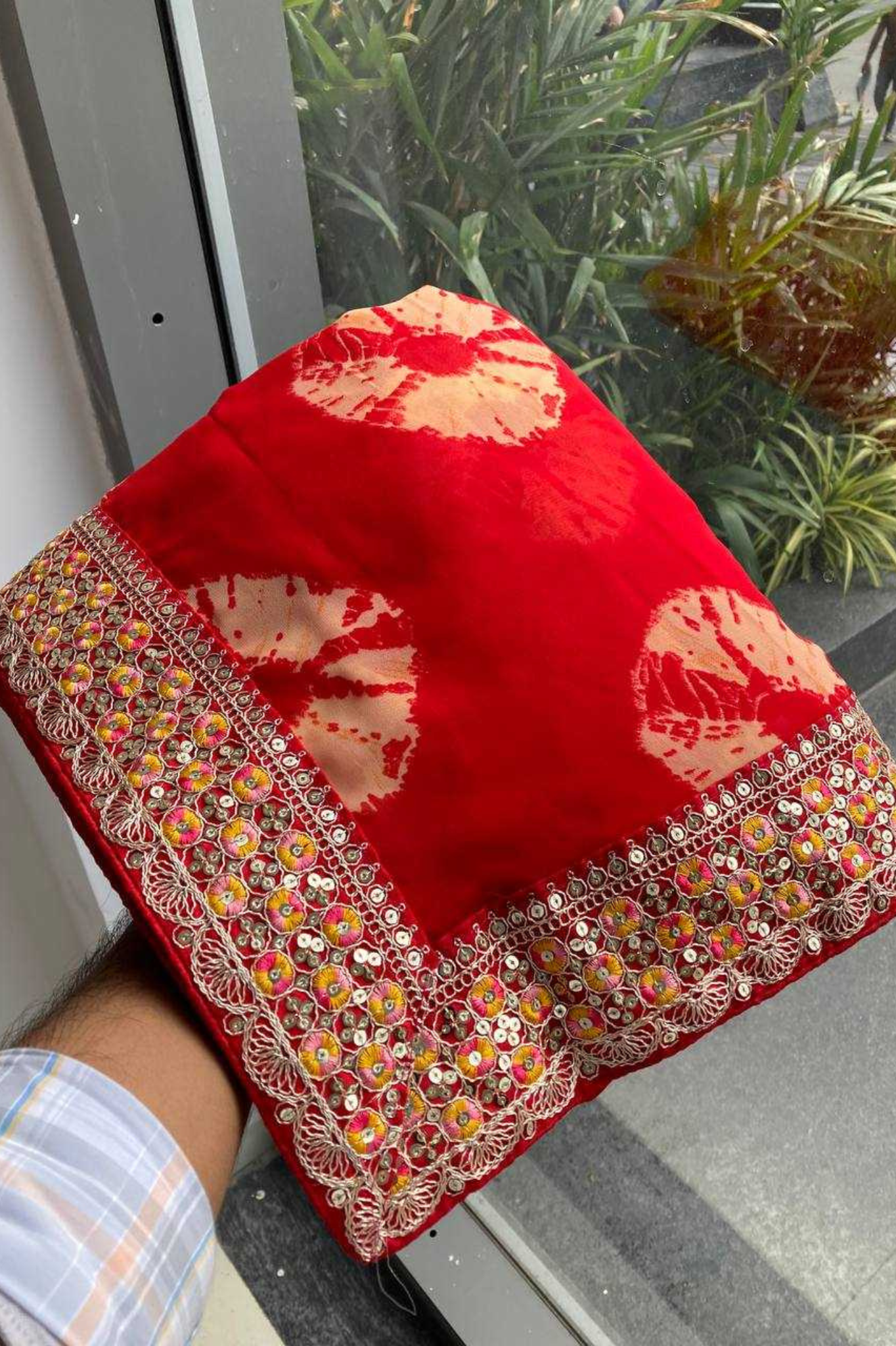 Looking for a saree that captures tradition and elegance in one? This stunning red soft georgette saree features a classic Bandhej print highlighted with a multi-embroidery lace border that adds royal charm. Paired with a heavy embroidered mono Banglory silk blouse, this saree is the perfect pick for weddings, festive functions, and grand celebrations.
