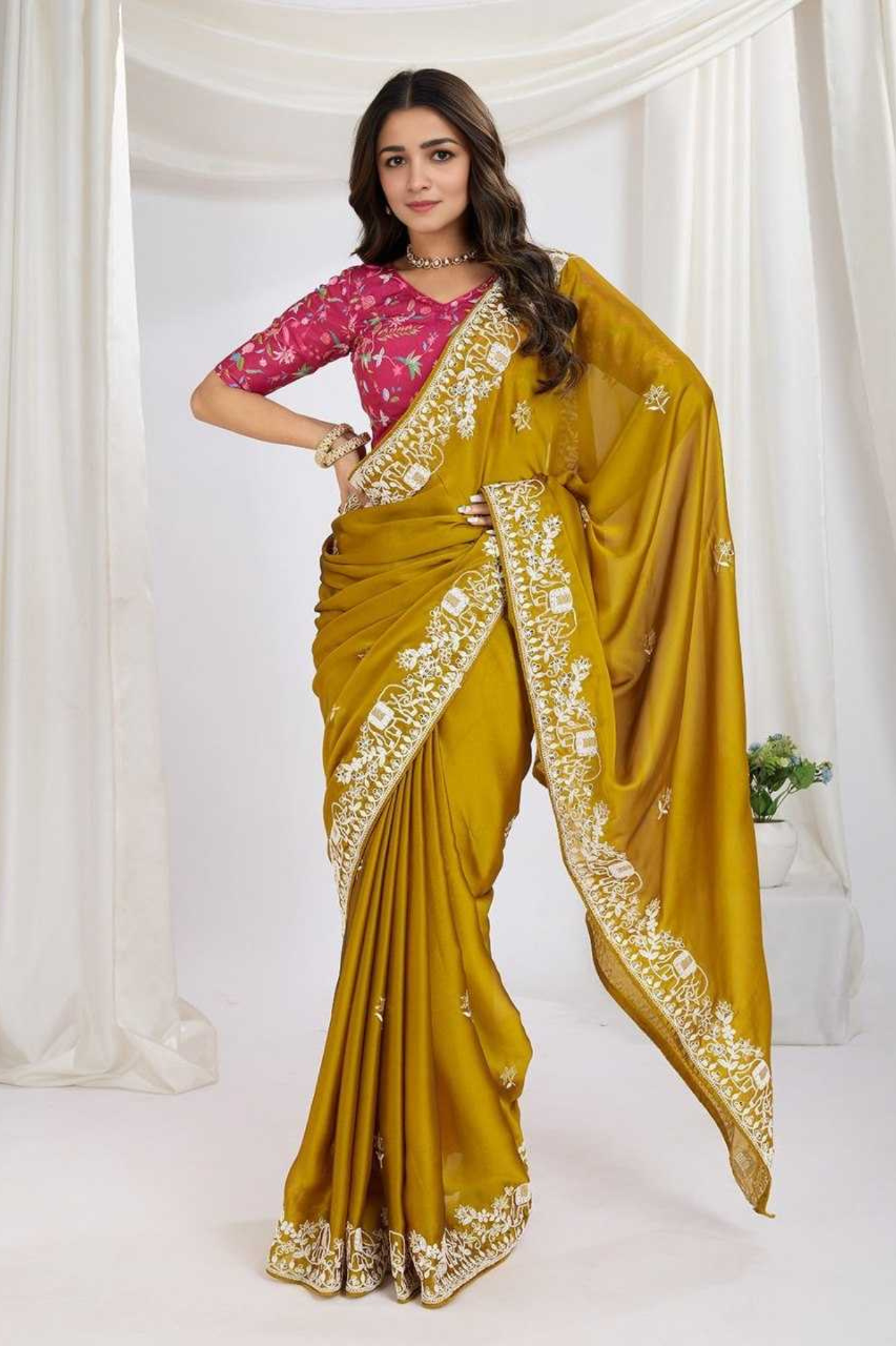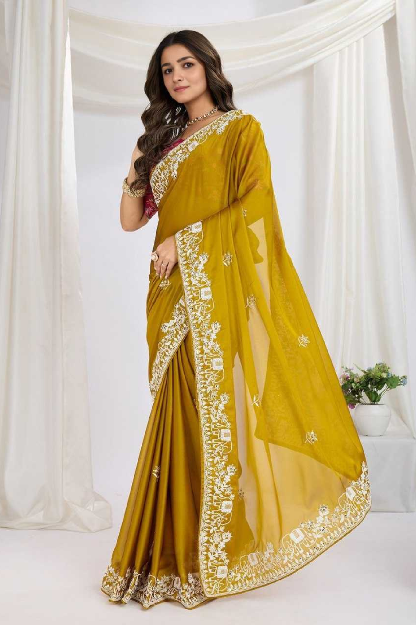 Looking for a saree in this same elegant mustard shade for your next wedding or festive occasion? This premium saree is crafted from Soft Rangoli Silk fabric, designed with an intricate embroidery lace border and detailed piping finish for a touch of luxury and refinement.