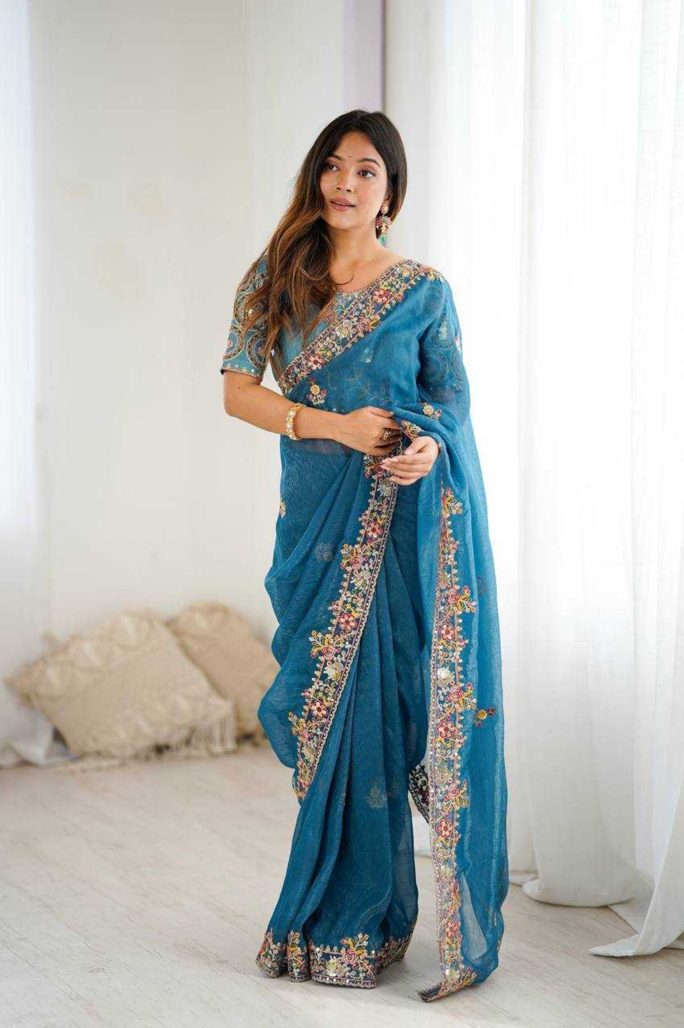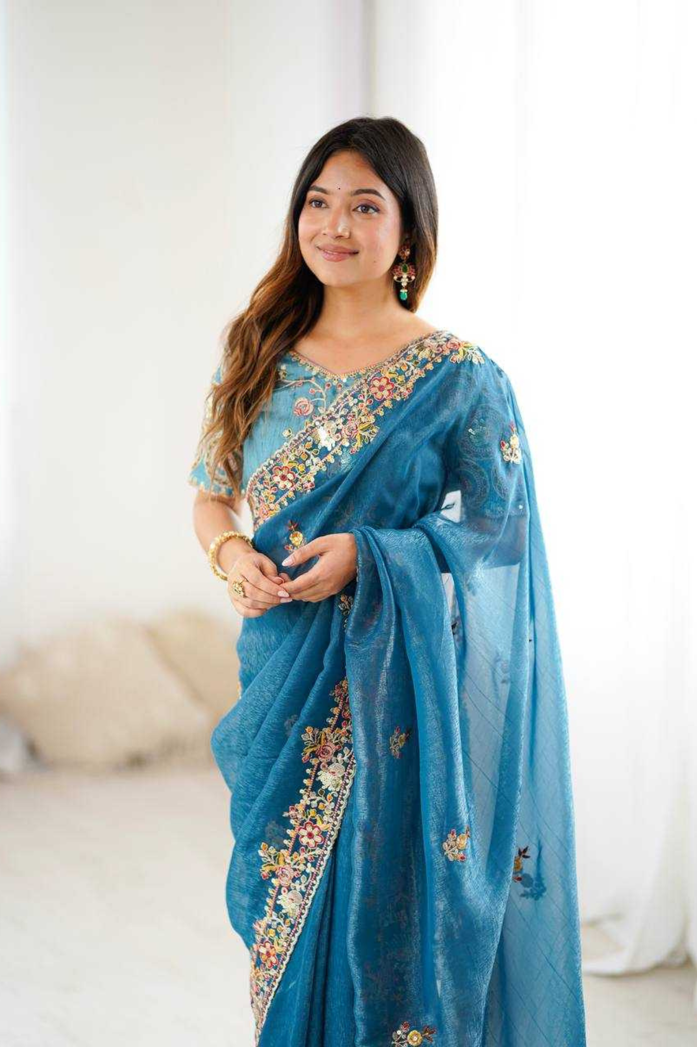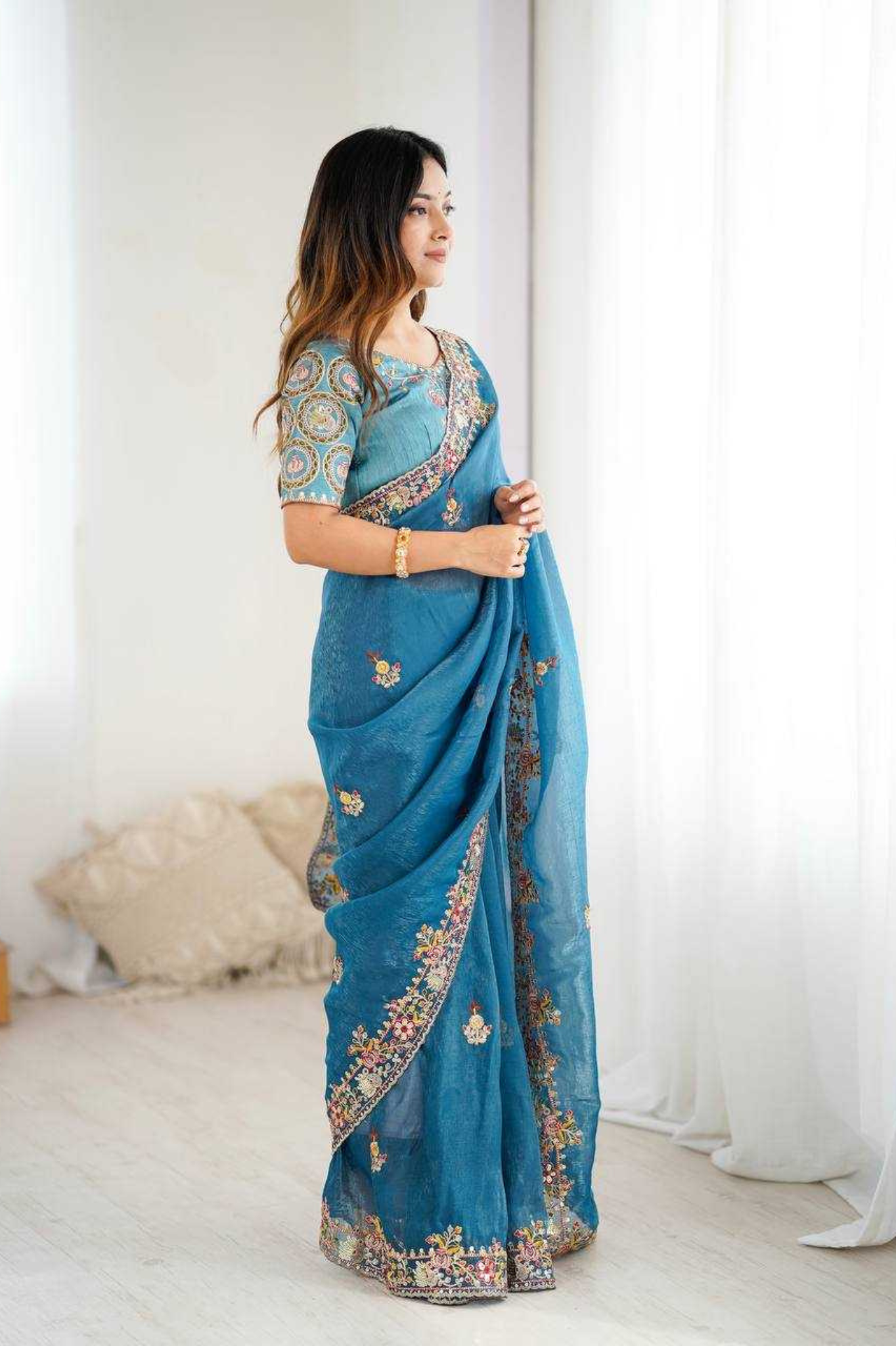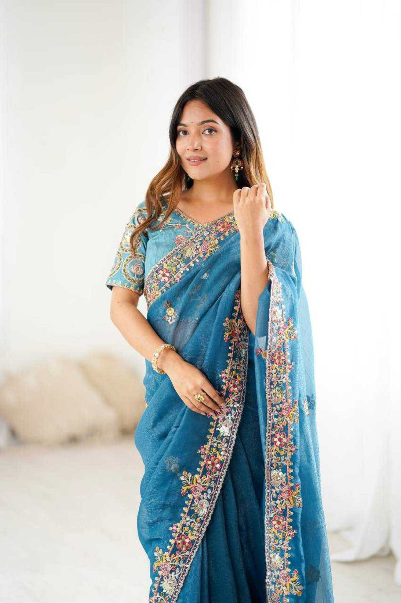 This Premium Crunchy Silk Saree brings together delicate craftsmanship and rich elegance. The refined embroidery paired with subtle shimmer makes it a timeless piece that drapes beautifully — ideal for women who love sophisticated festive fashion.