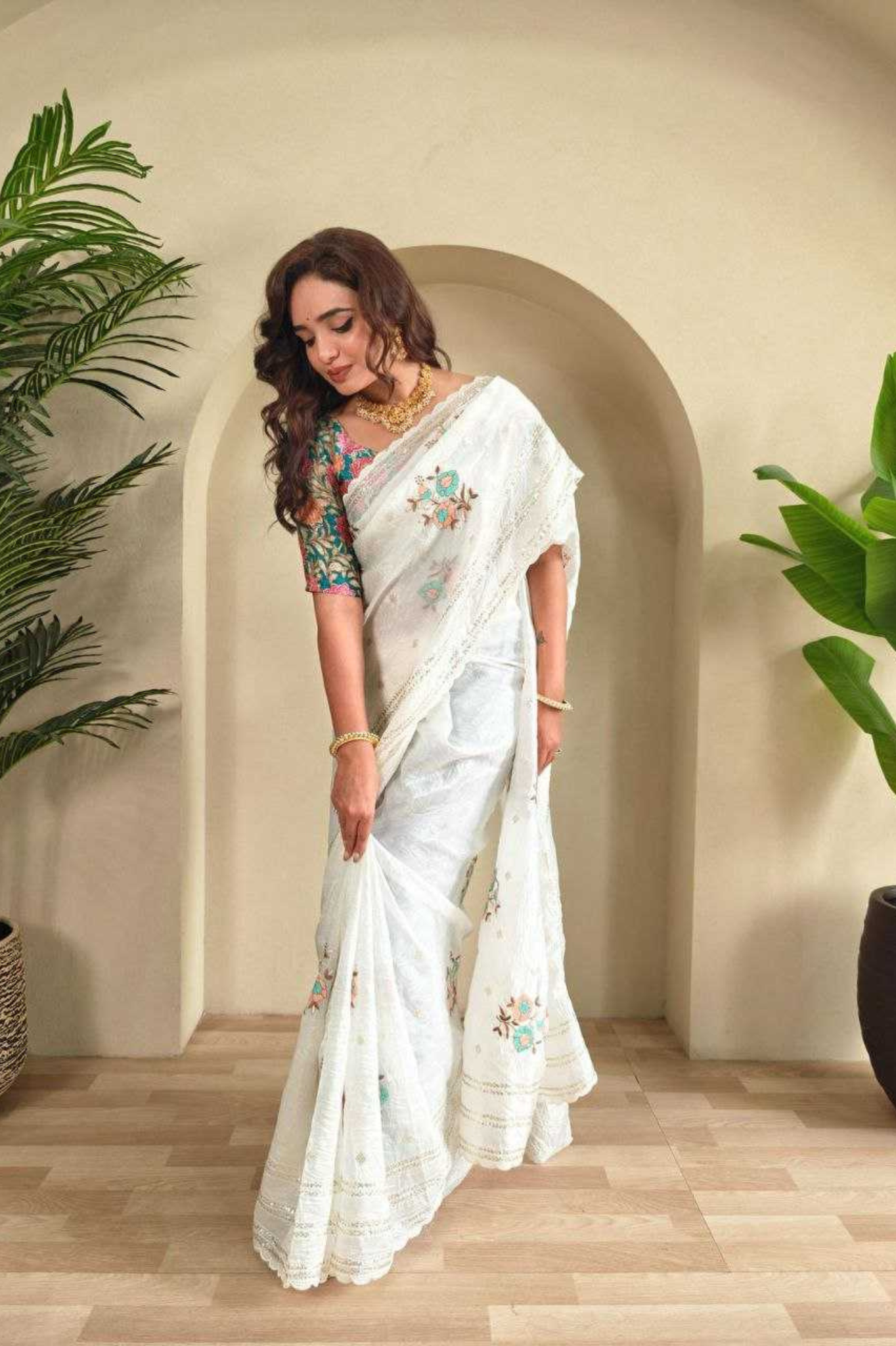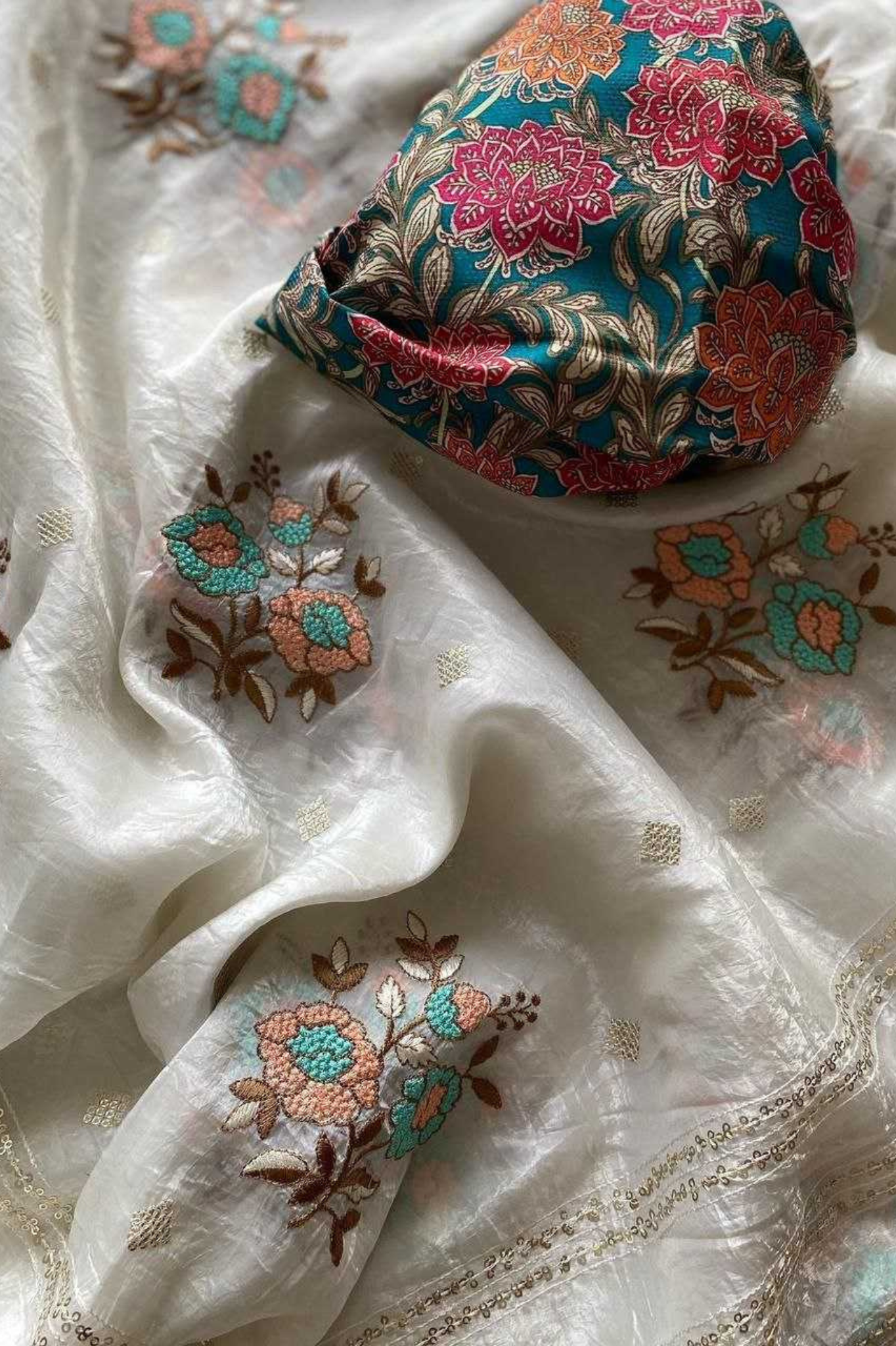 An elegant drape crafted from premium crunchy chiffon, this saree features a graceful scallop design with fine thread embroidery work,...