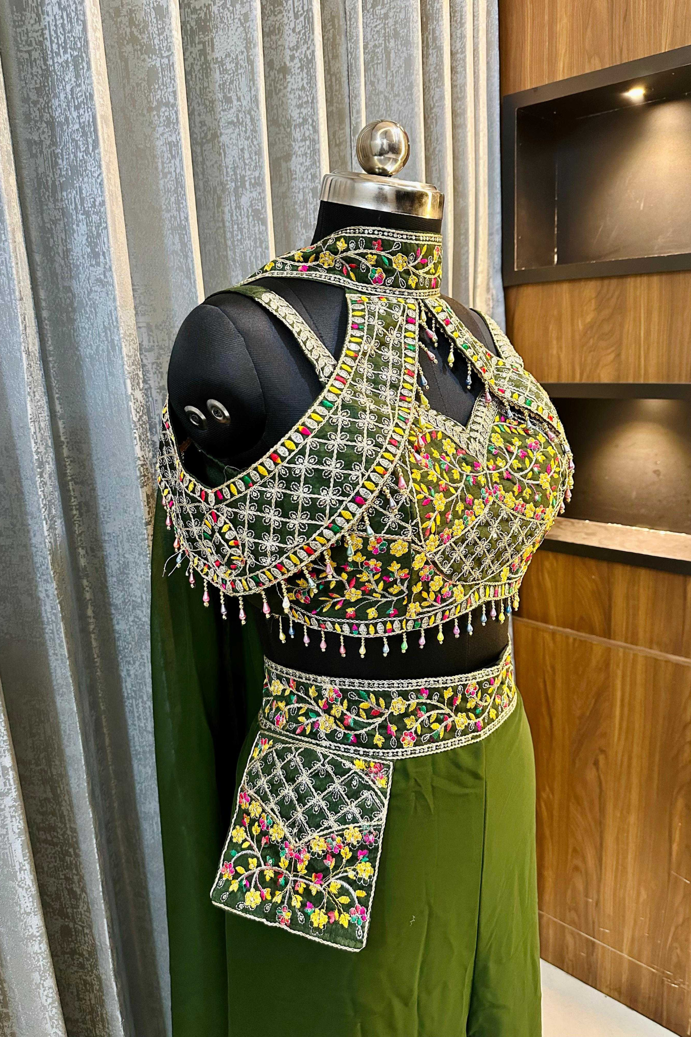 Turn heads with this elegant three-piece green Indo-Western palazzo set crafted from premium fabrics and highlighted with intricate multicolour embroidery...