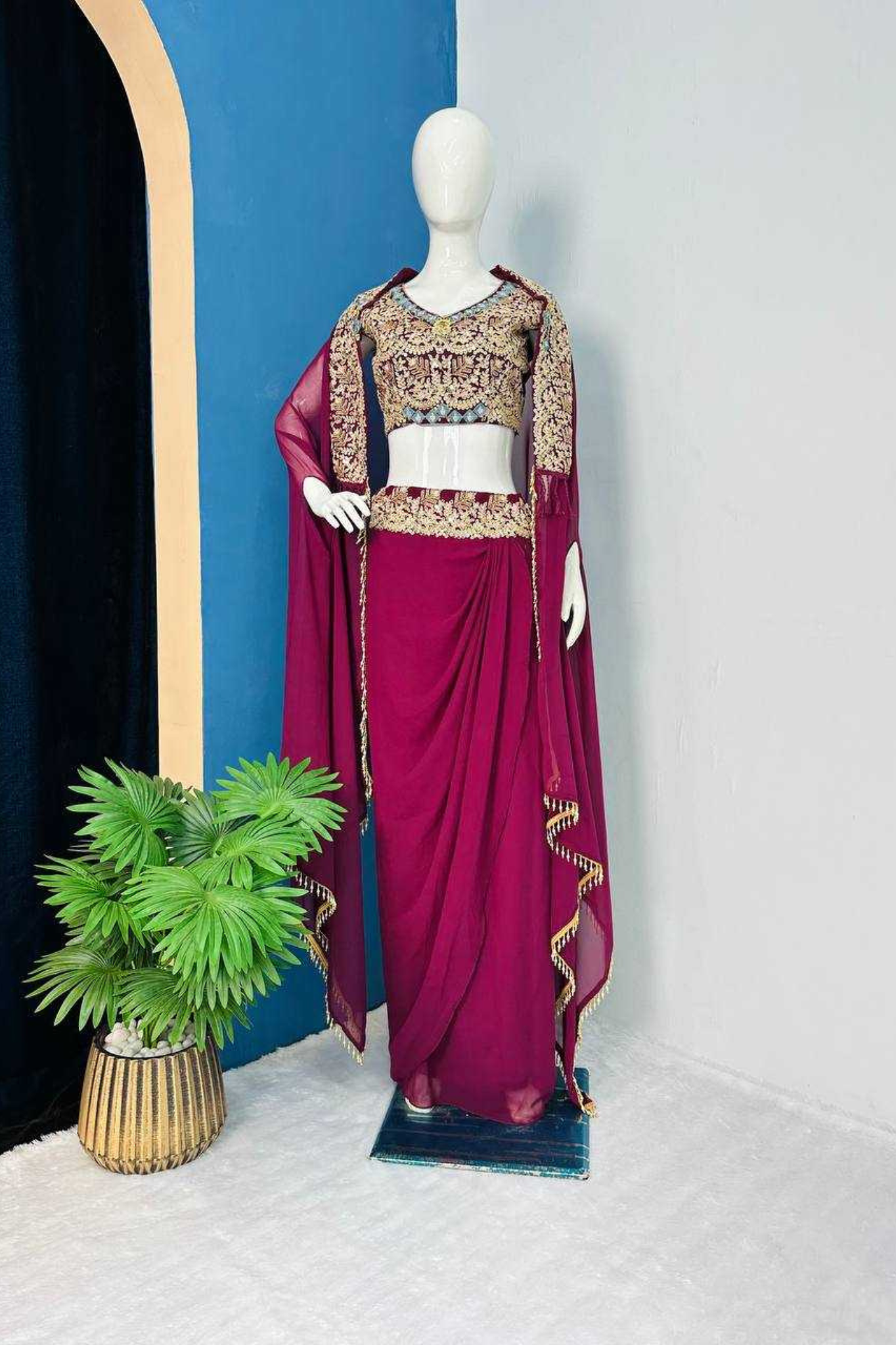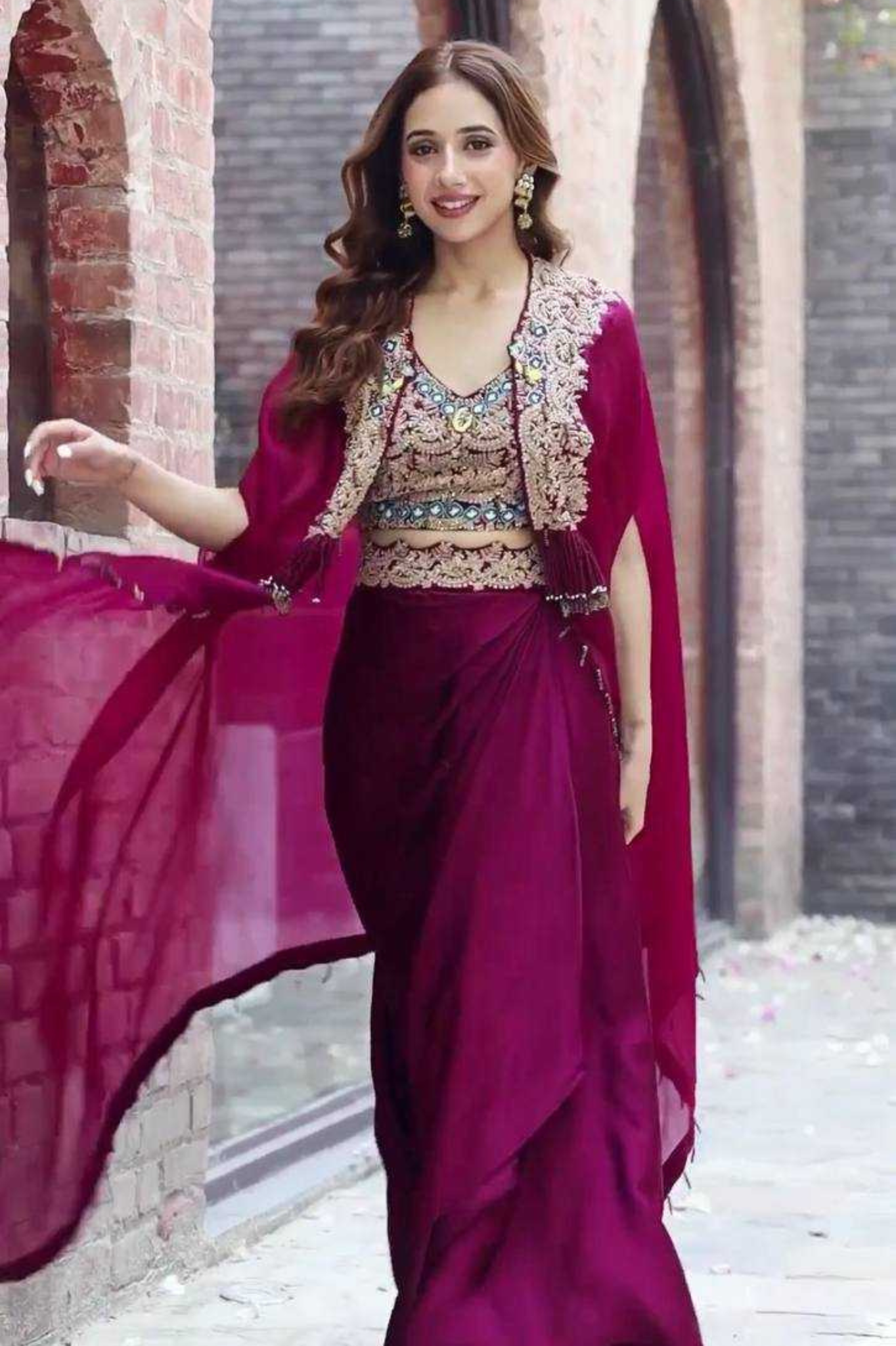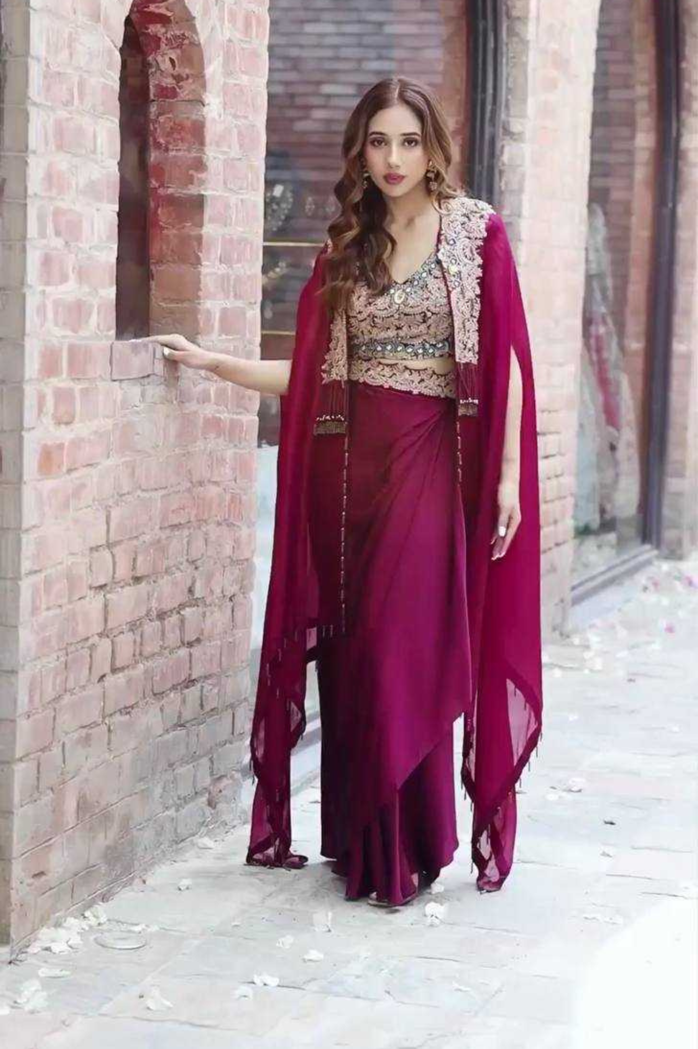 Elegant Maroon Indo-Western Drape Set with Embroidered Blouse