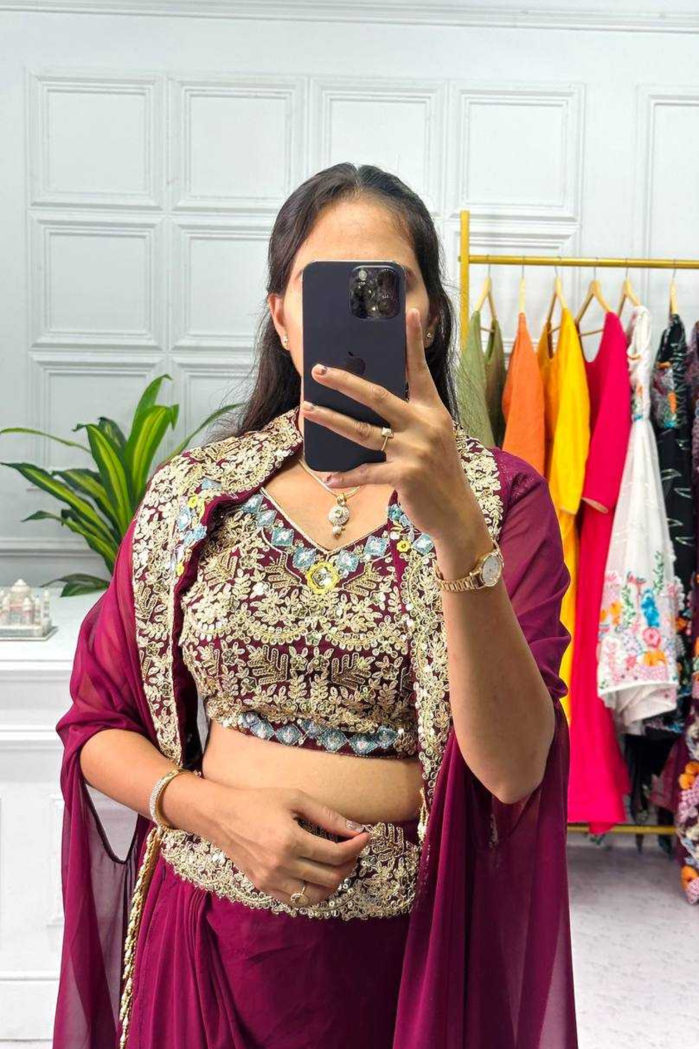 A statement-making Indo-Western set in a rich maroon shade, designed for festive and wedding occasions. The outfit includes a Georgette draped skirt paired with a heavily embroidered blouse featuring intricate thread, sequin, and mirror work. The look is elevated with a flowy Georgette shrug finished with fine embroidery and tassel detailing on the edges.