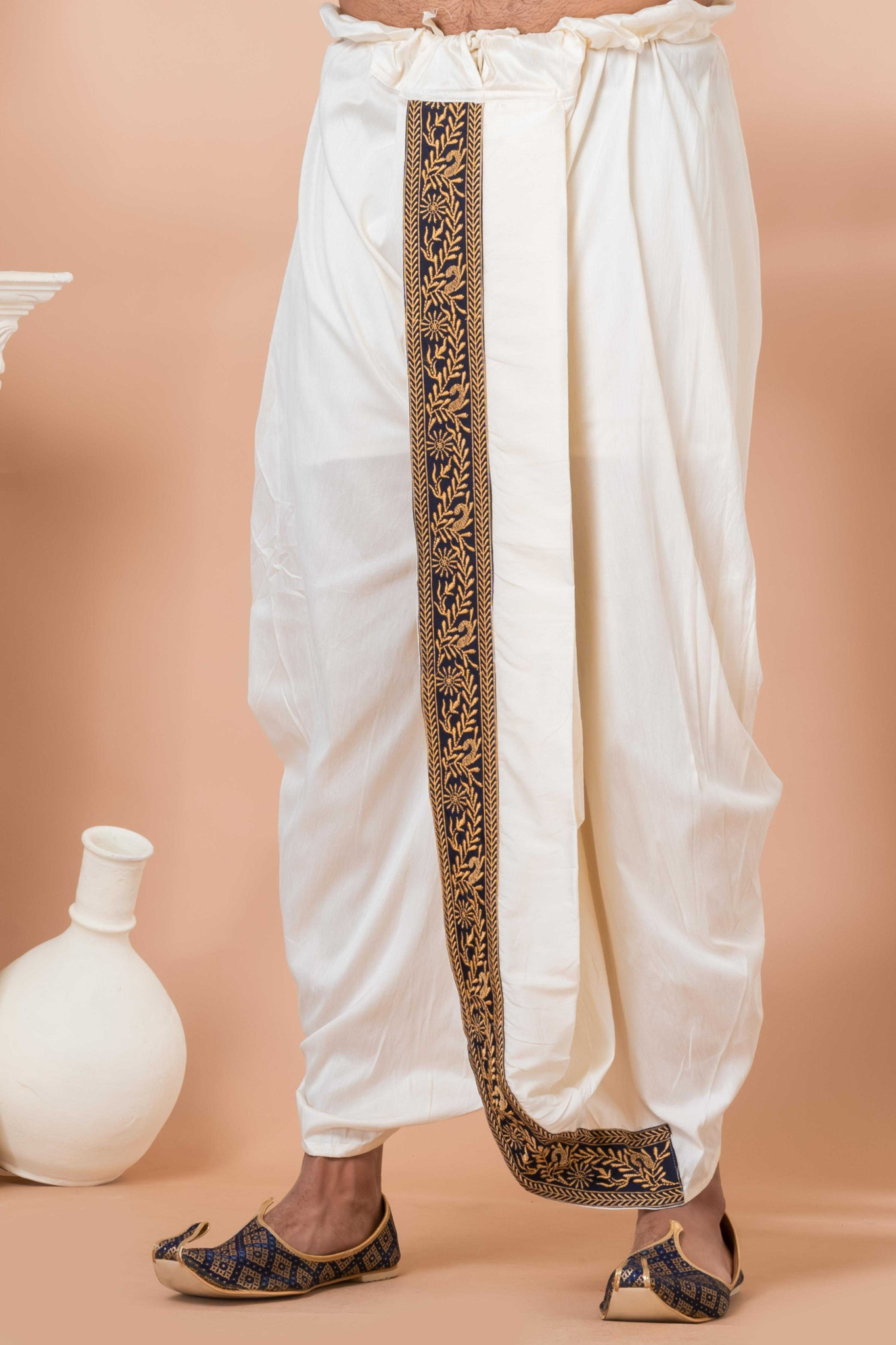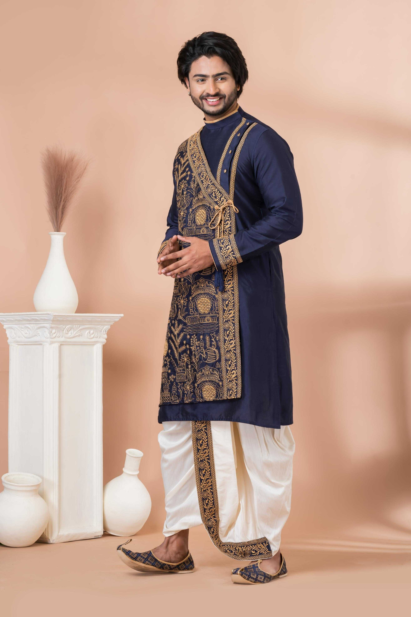 Add elegance to your ethnic wardrobe with this men’s embroidered kurta pajama set crafted from premium fabric in navy blue with intricate golden thread embroidery. The kurta features exquisite detailing on the front, cuffs, and dupatta-style drape for a regal finish. Paired with an ivory dhoti-style pajama and matching embroidered mojari, this ensemble is a perfect choice for weddings, festive occasions, and grand celebrations.