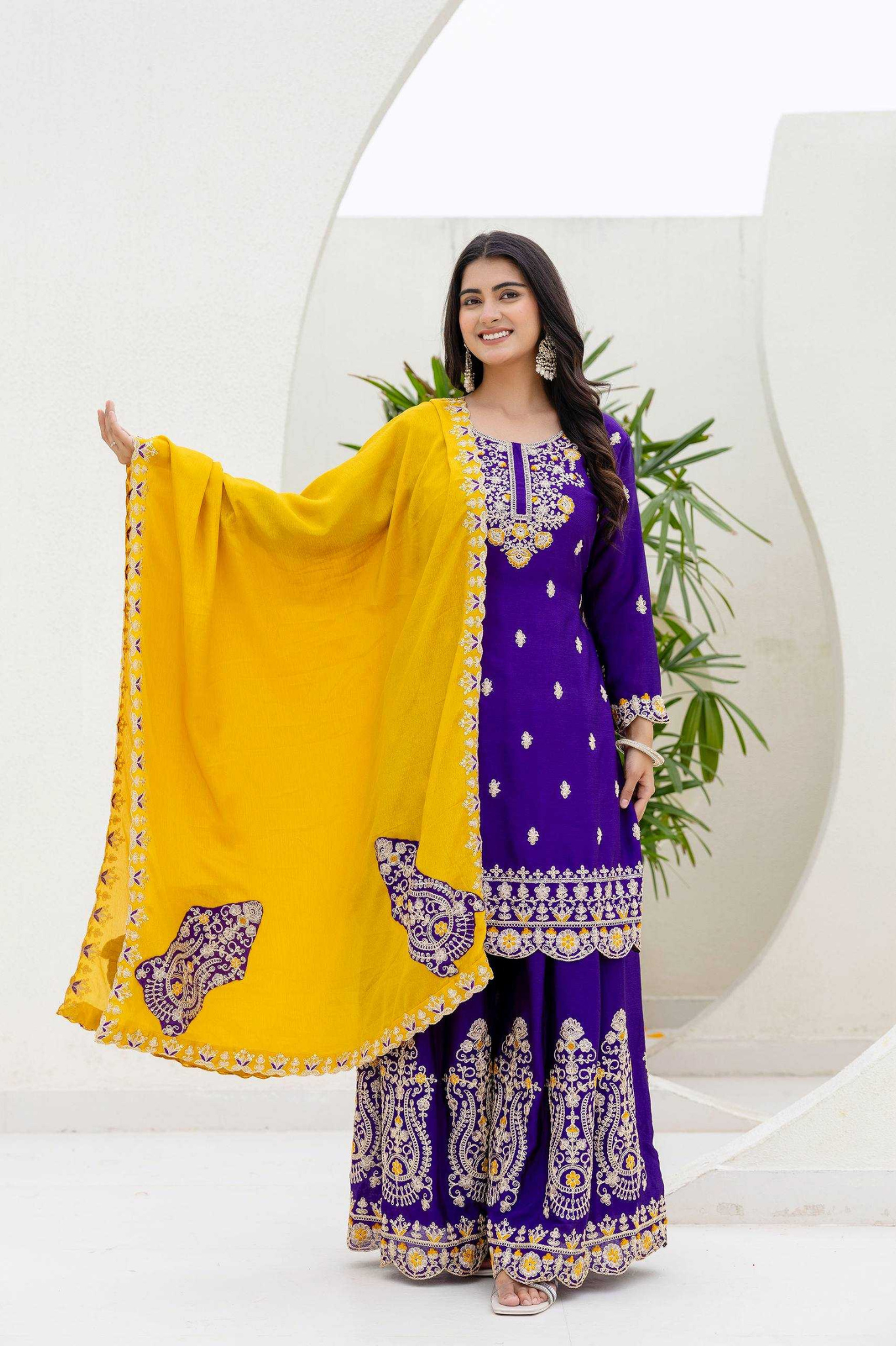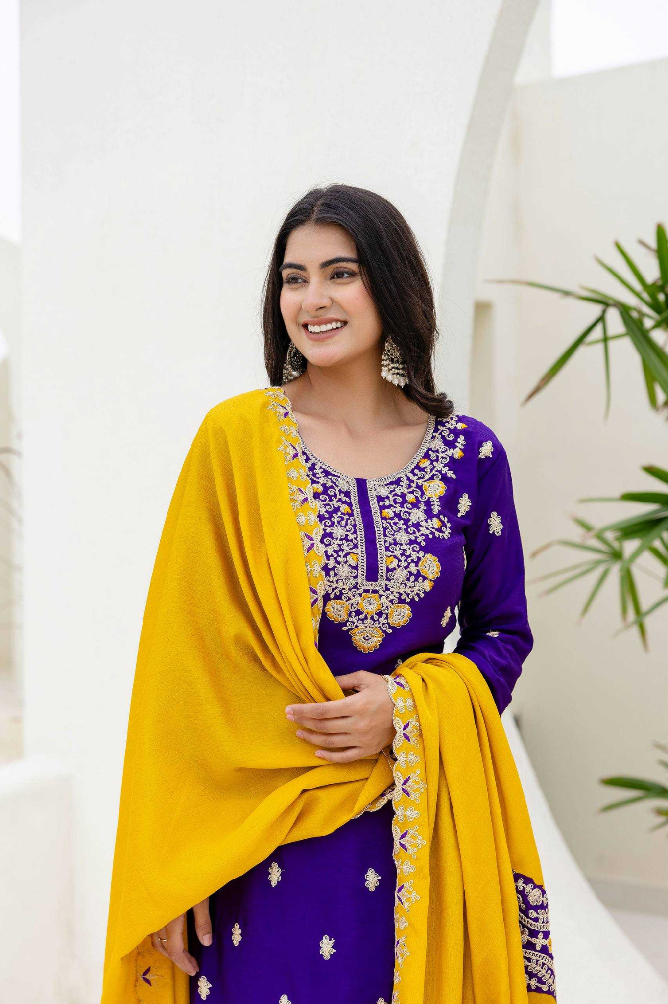 An elegant stitched kurti set crafted in premium chinon silk, featuring detailed embroidery and vibrant contrast dupatta – perfect for festive occasions and celebrations.