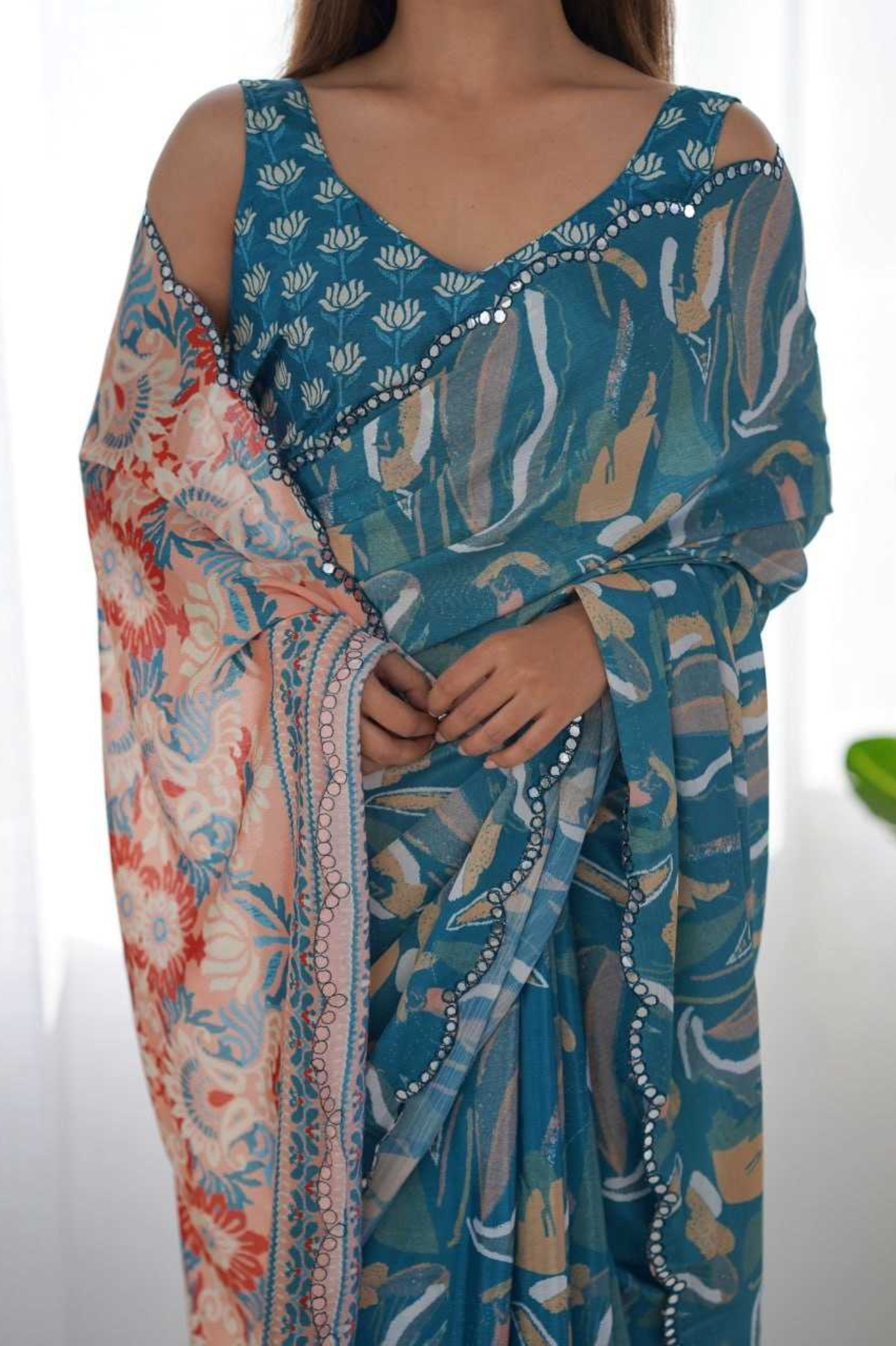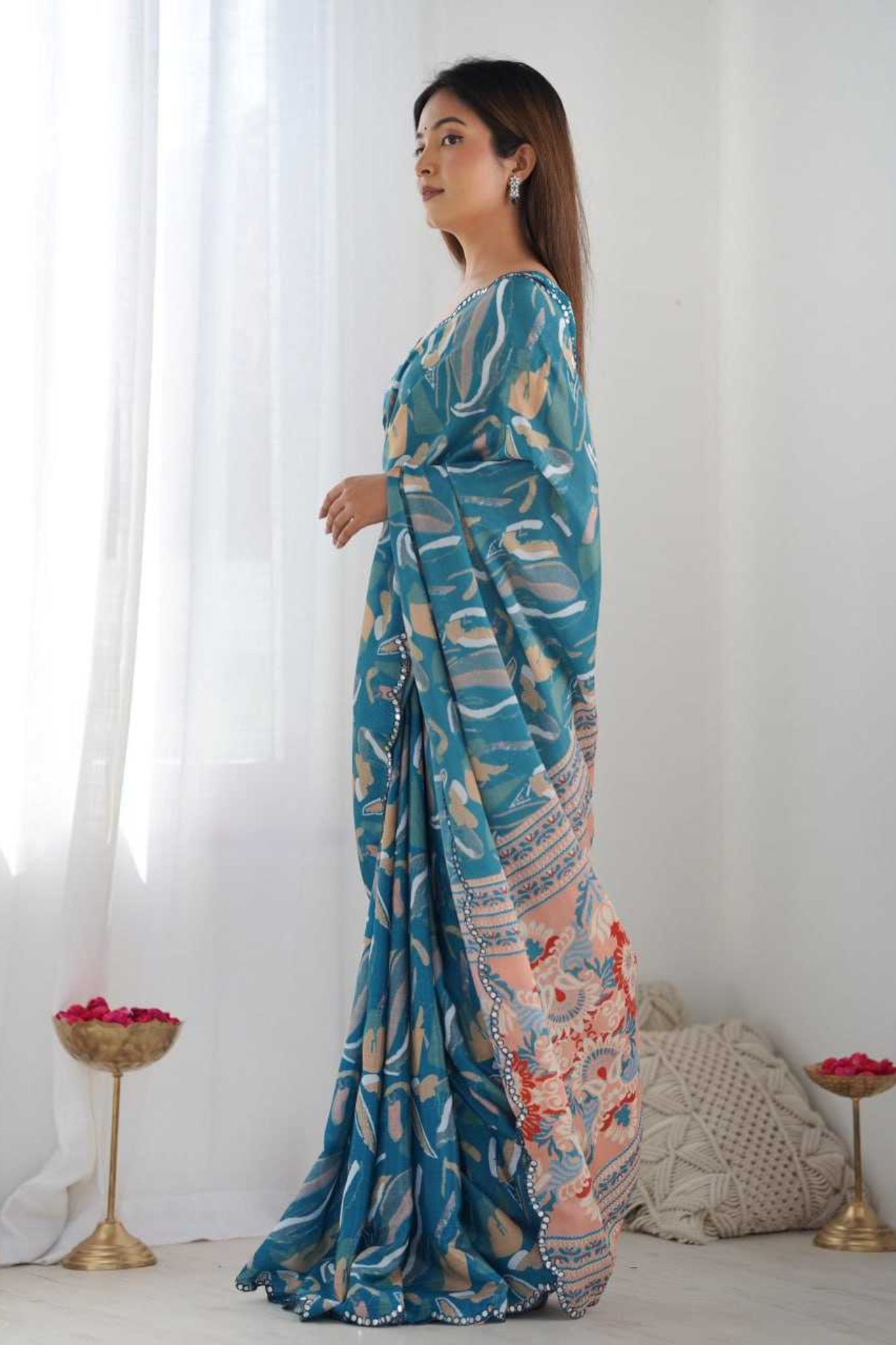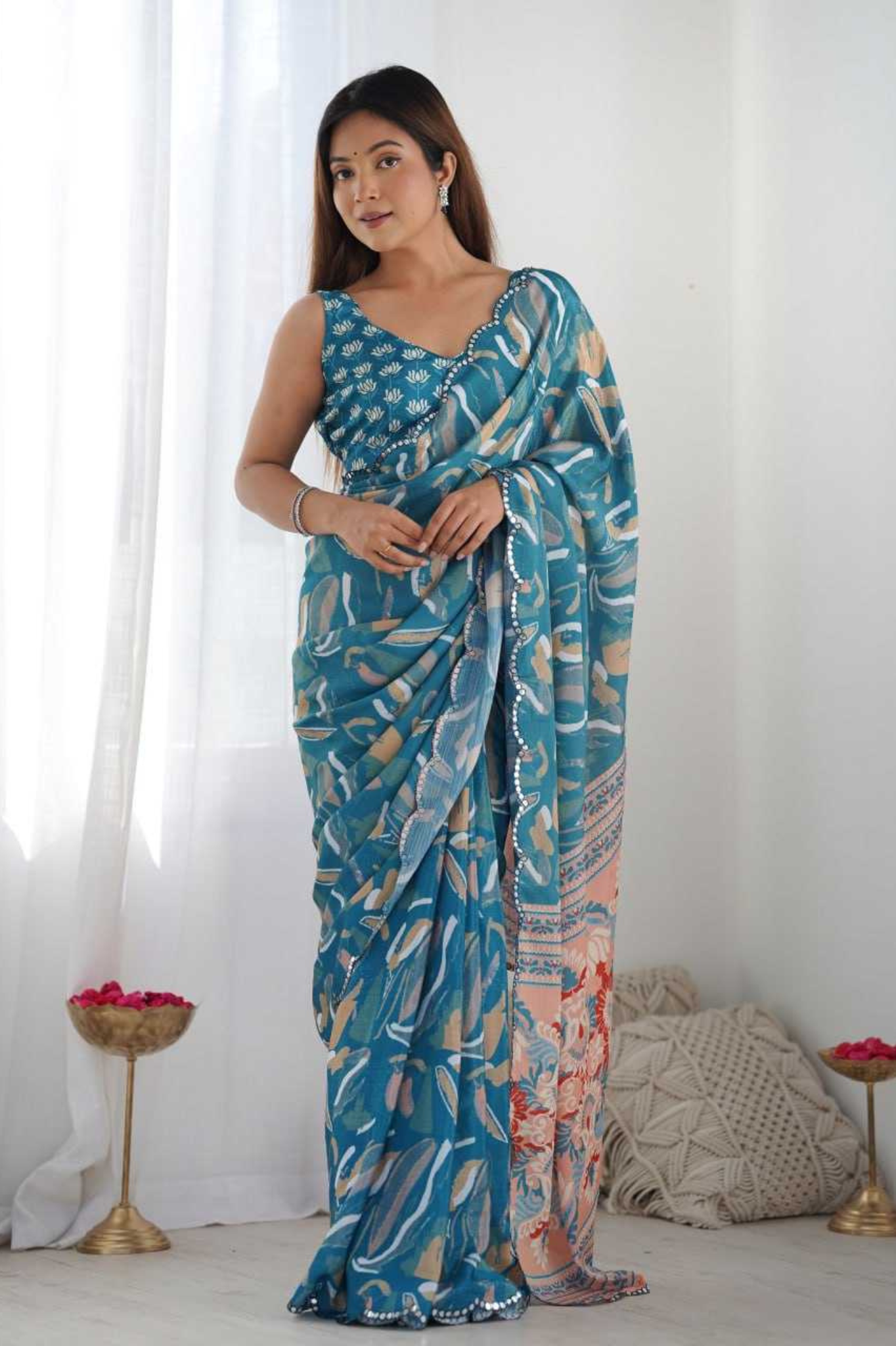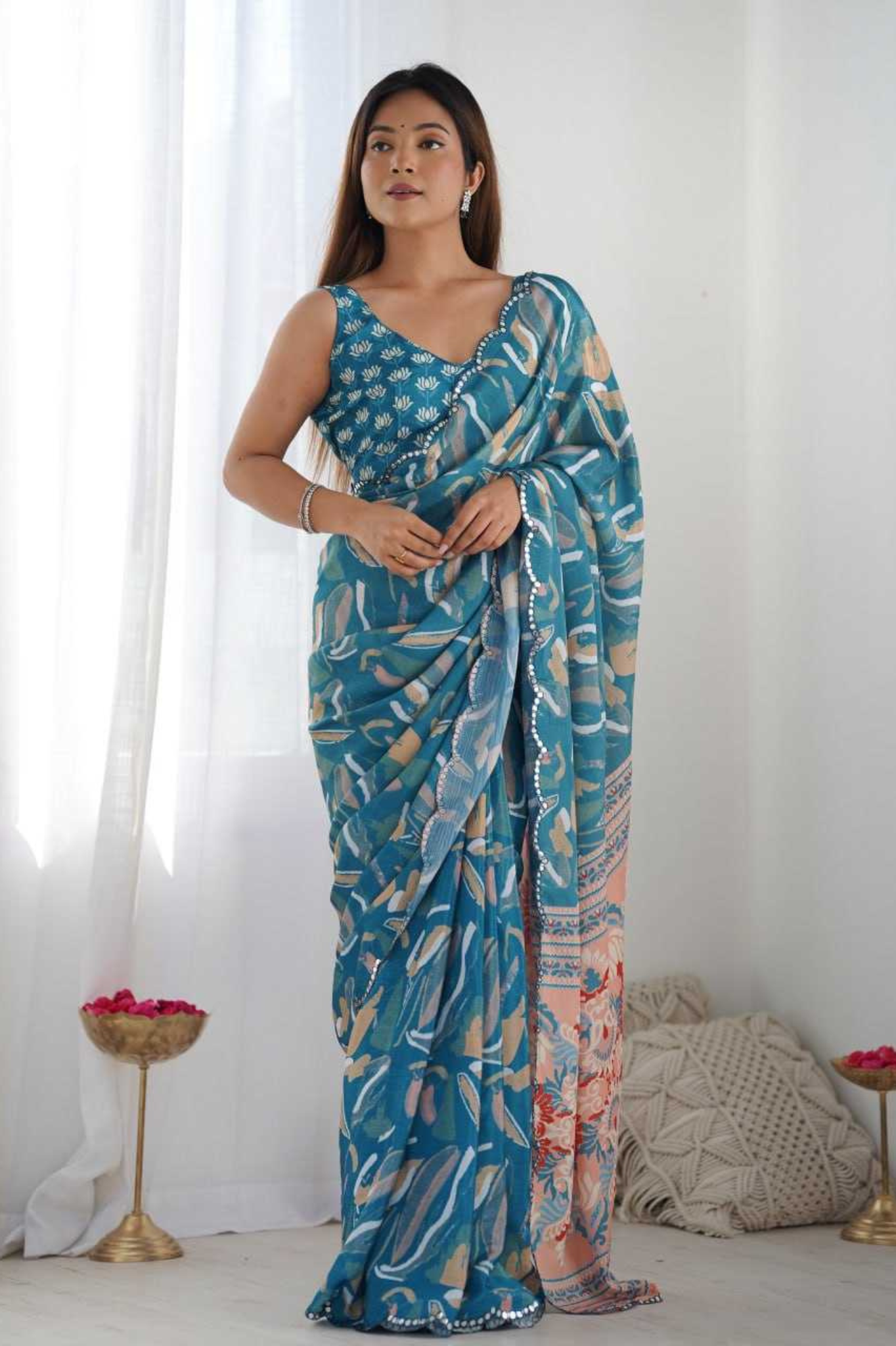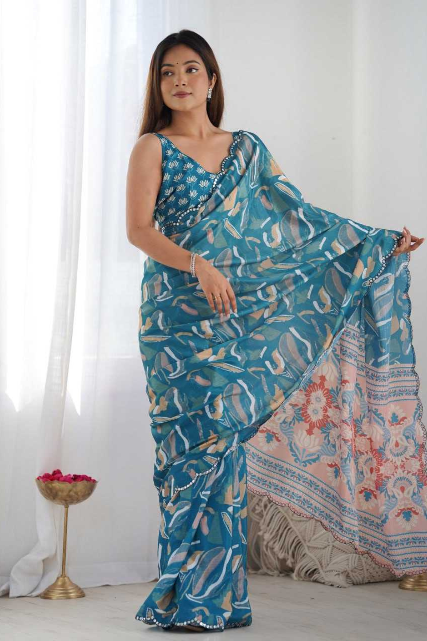 Turn heads effortlessly with this Teal Blue Heavy Chinnon Saree, featuring a refreshing abstract floral print that exudes modern sophistication. The saree is elevated with a Kutchi-style mirror lace border, adding just the right touch of festive sparkle and grace.