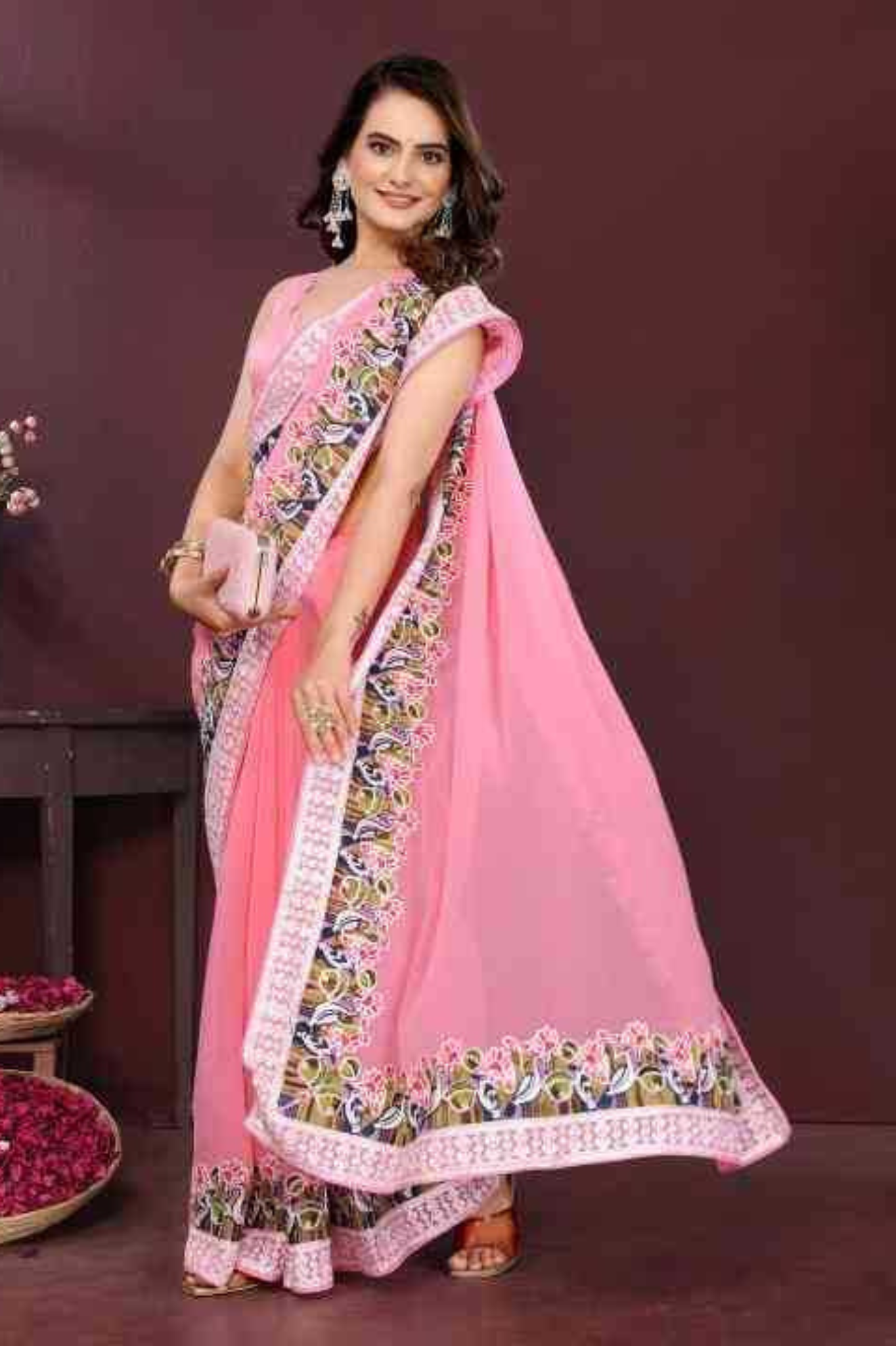 Soft Pink Georgette Saree with Embroidery Cutwork Lace Border