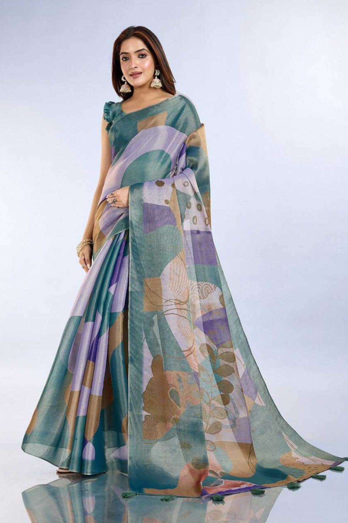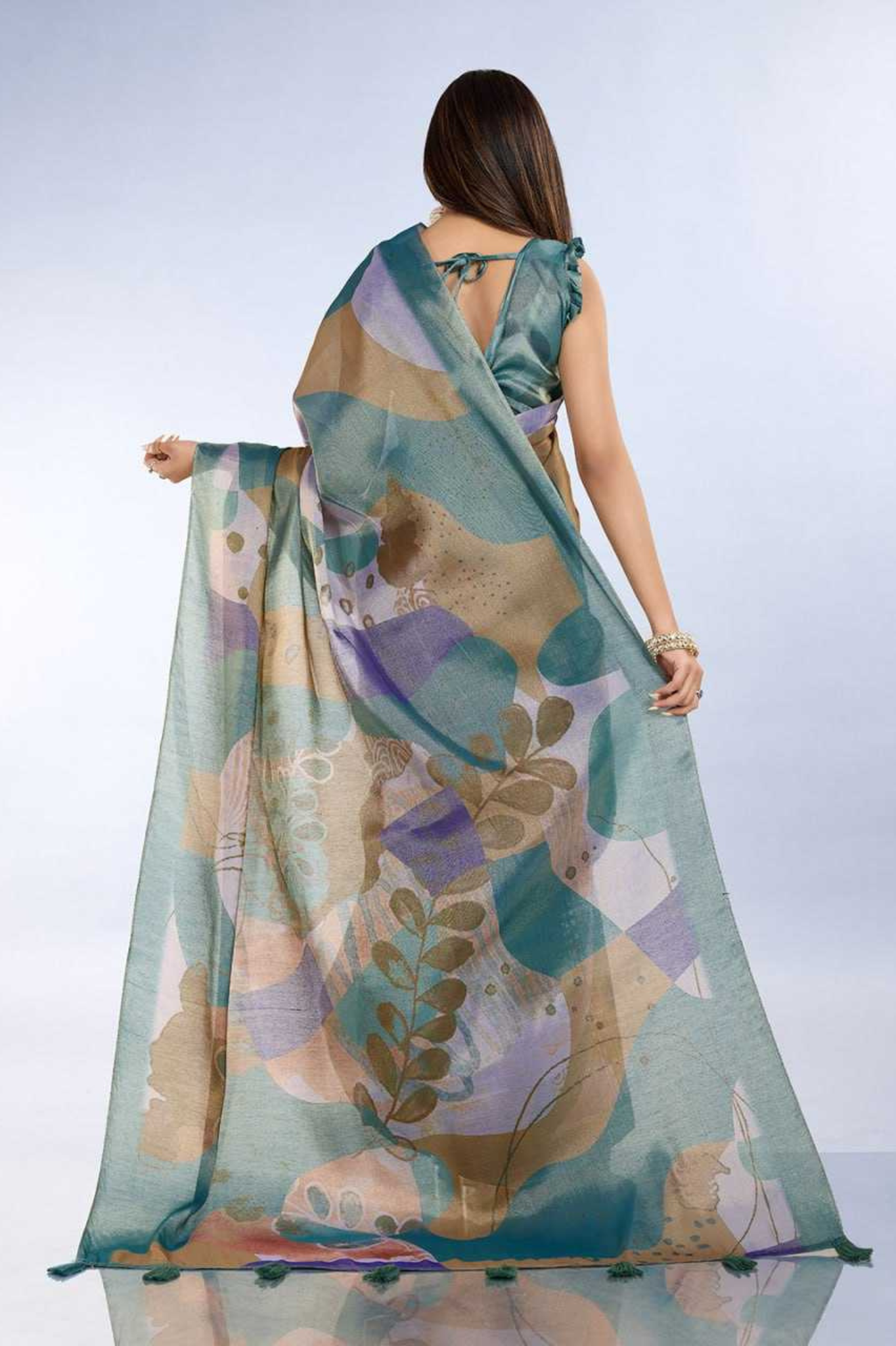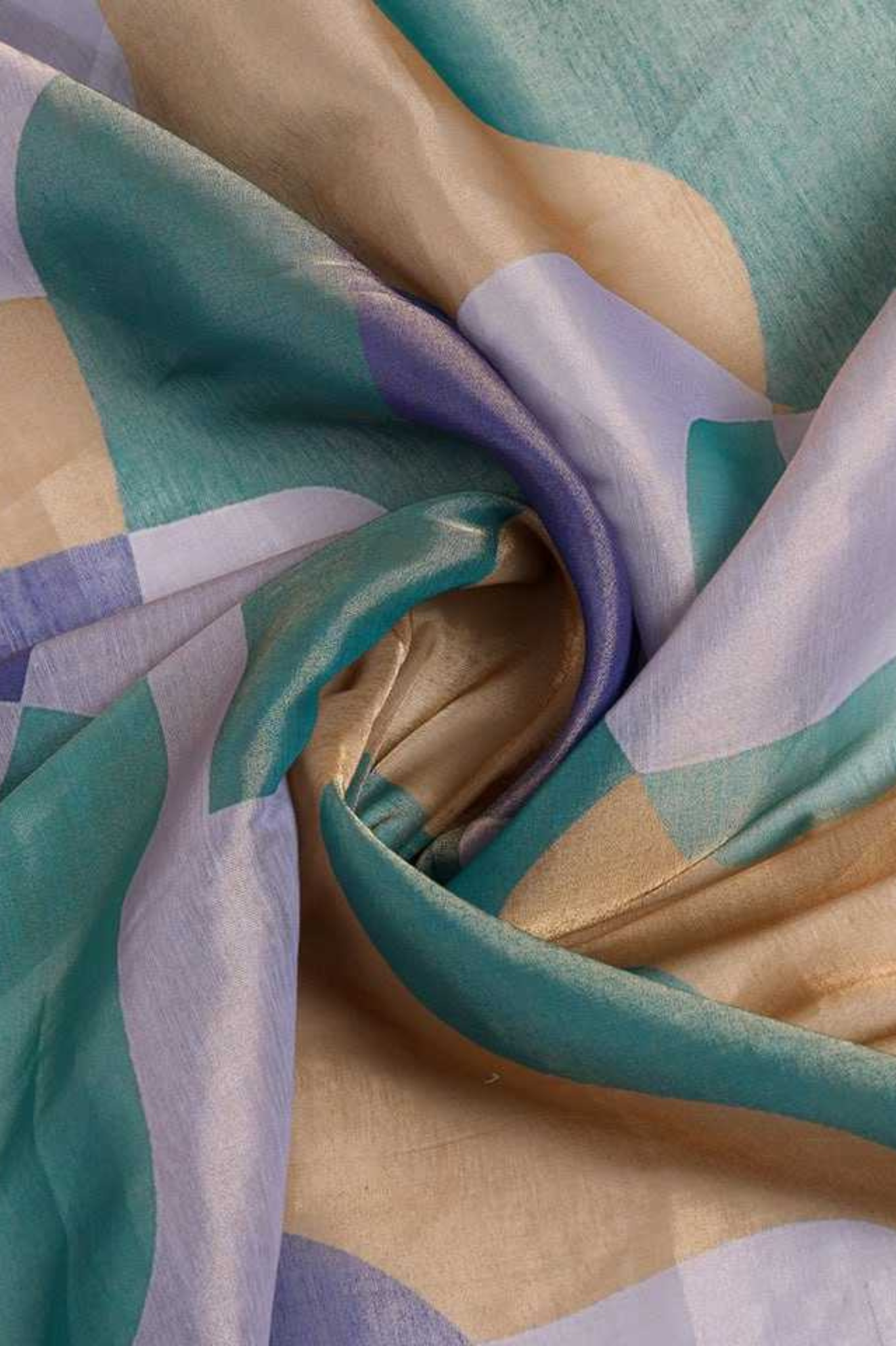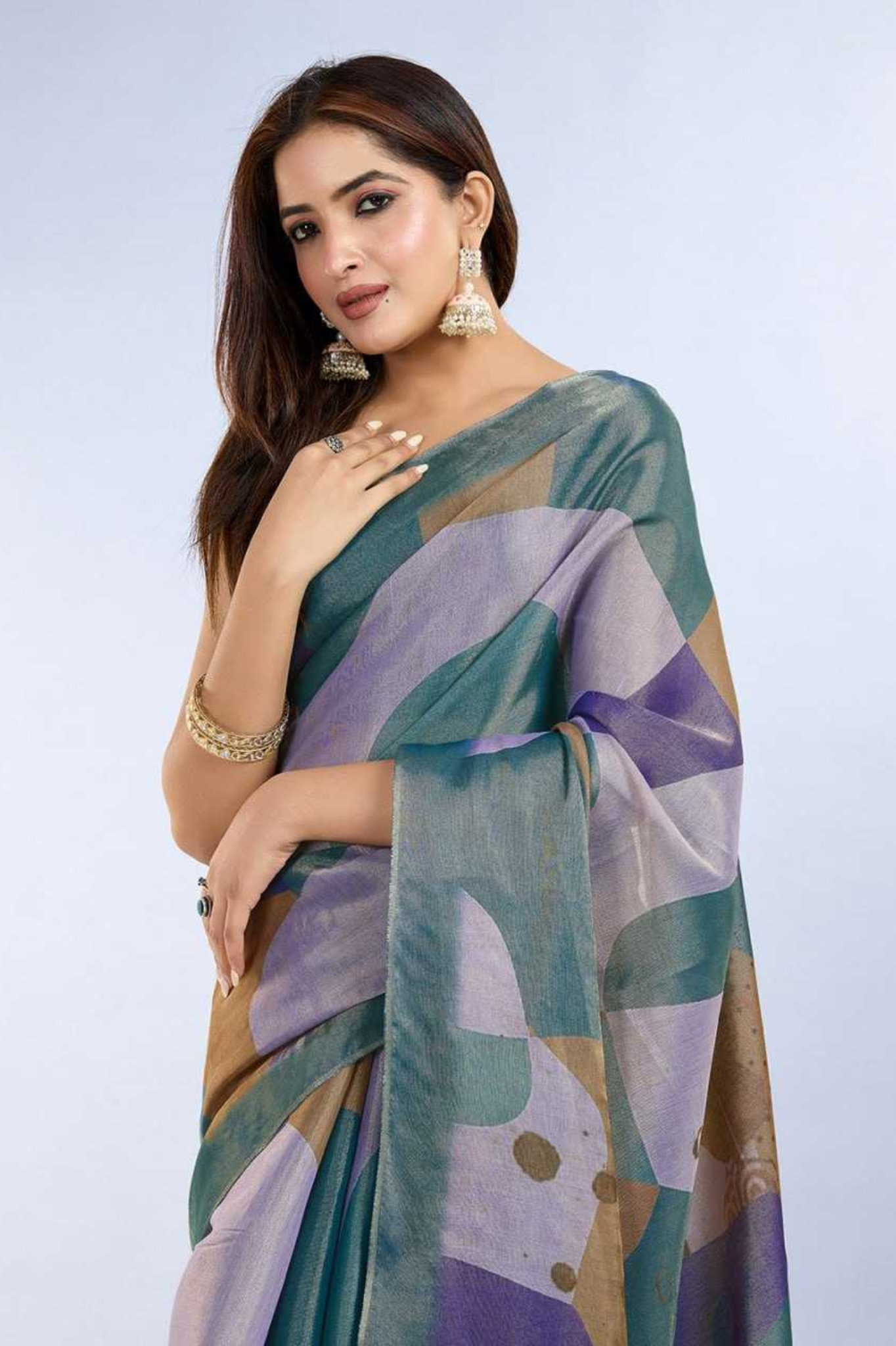 Step into effortless elegance with this modern abstract print saree crafted in luxurious Erode Anmol Silk. The soothing blend of teal, lavender, and earthy beige tones brings out a sophisticated and contemporary appeal. With its fluid drape and lightweight texture, this saree is an ideal choice for both daytime festivities and evening gatherings.