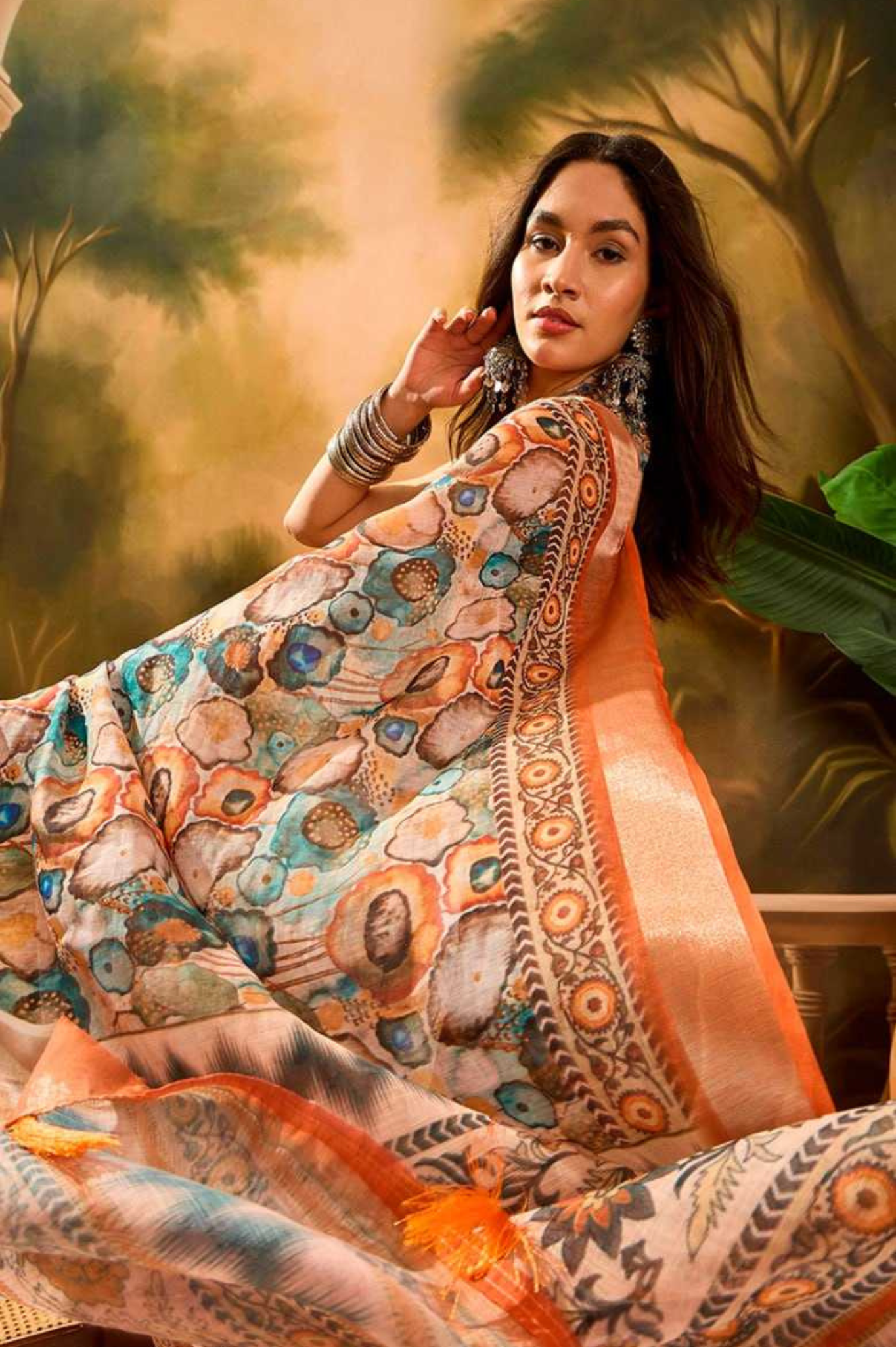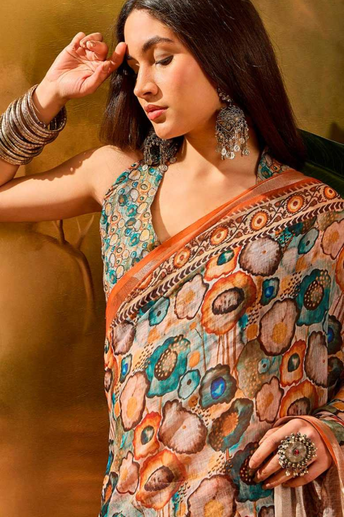 Made from soft and breathable linen cotton, this saree perfectly balances everyday comfort with timeless sophistication. The lightweight texture ensures effortless draping and all-day ease, while the watercolor-inspired floral patterns over a teal base bring a touch of contemporary charm to traditional aesthetics.