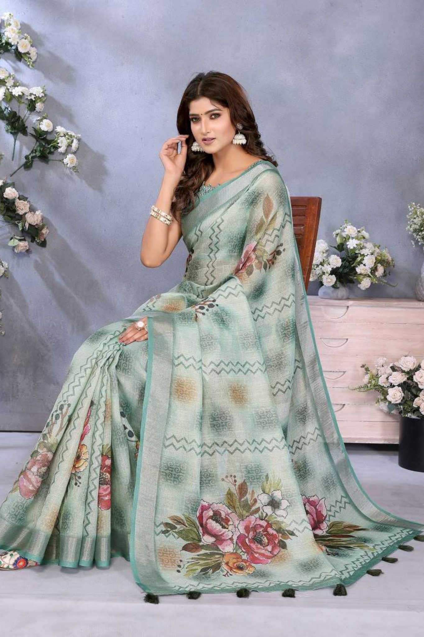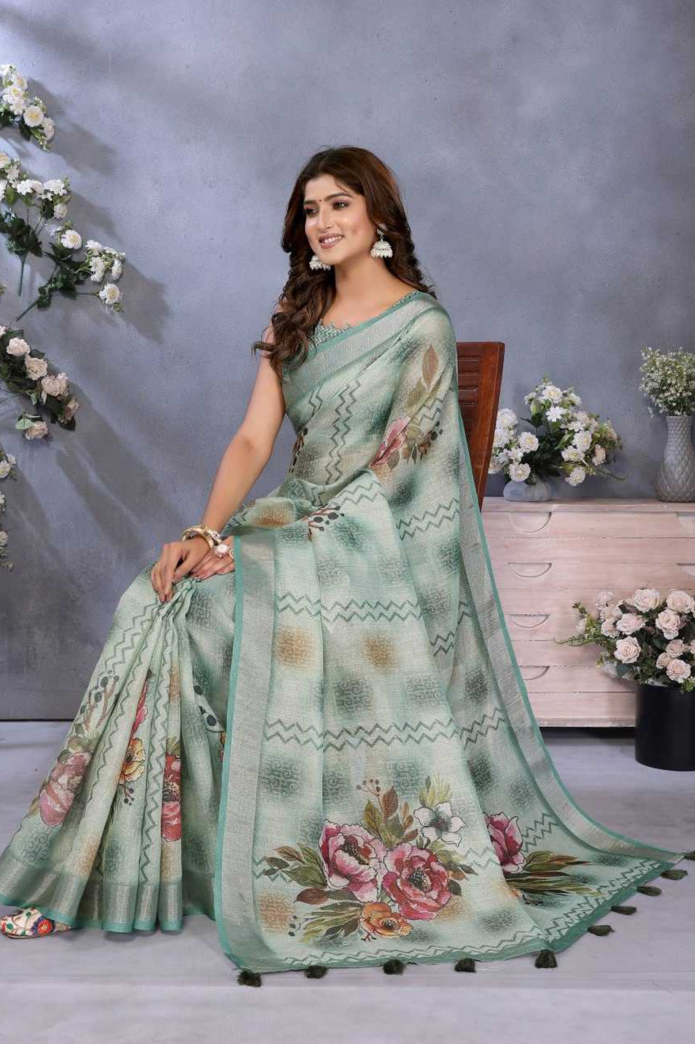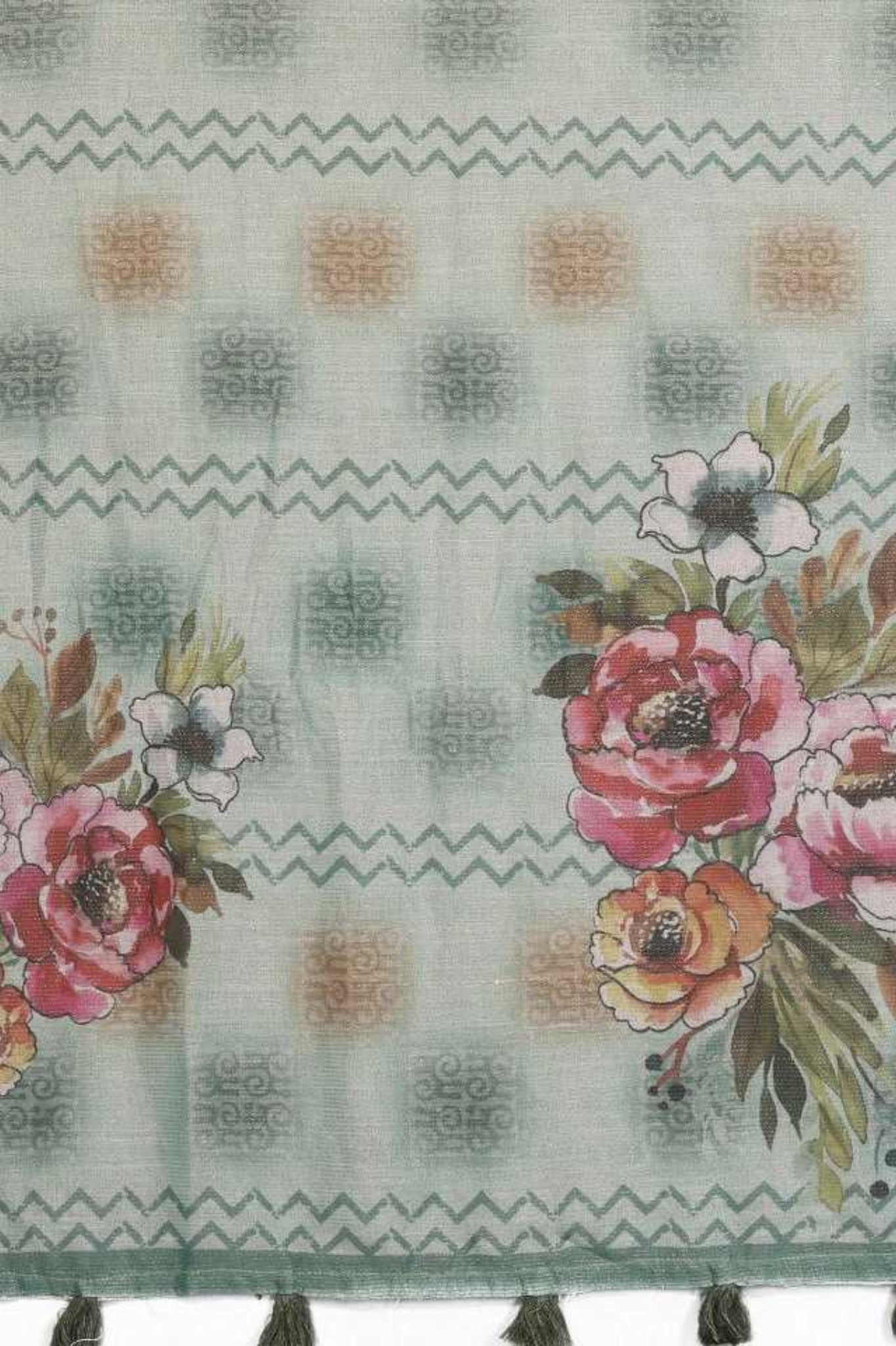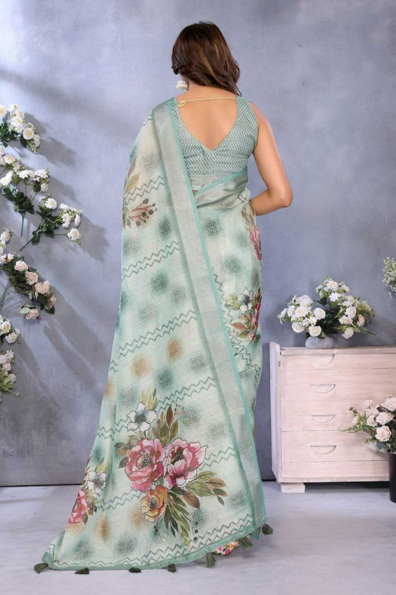 This mint green saree radiates freshness with its serene blend of soft hues and elegant floral prints. The subtle checkered texture paired with delicate zigzag patterns adds a touch of contemporary style while keeping the traditional essence alive. Crafted in lightweight linen shimmer fabric, it drapes gracefully, making it an ideal choice for festive occasions, weddings, and cultural gatherings.