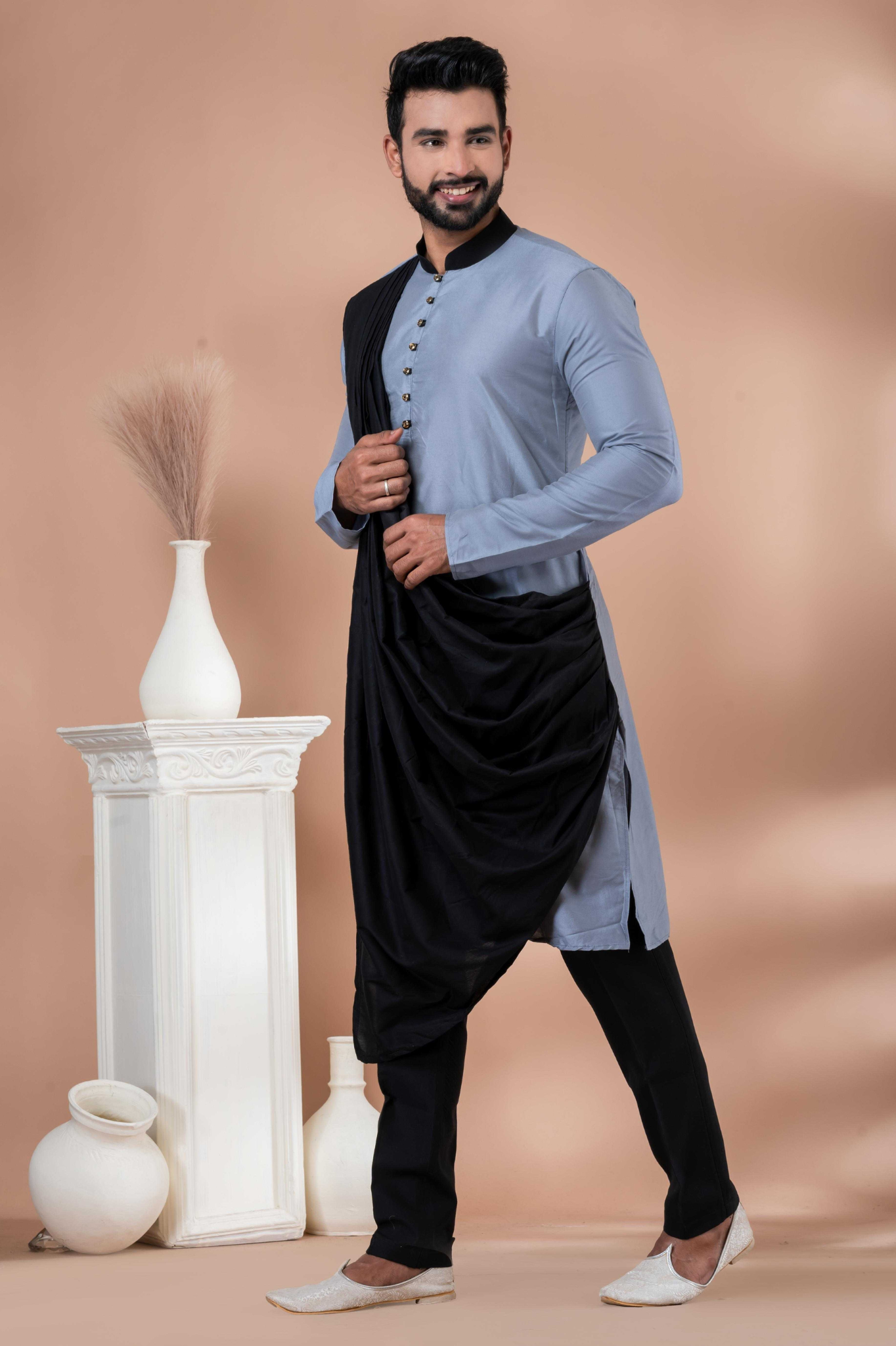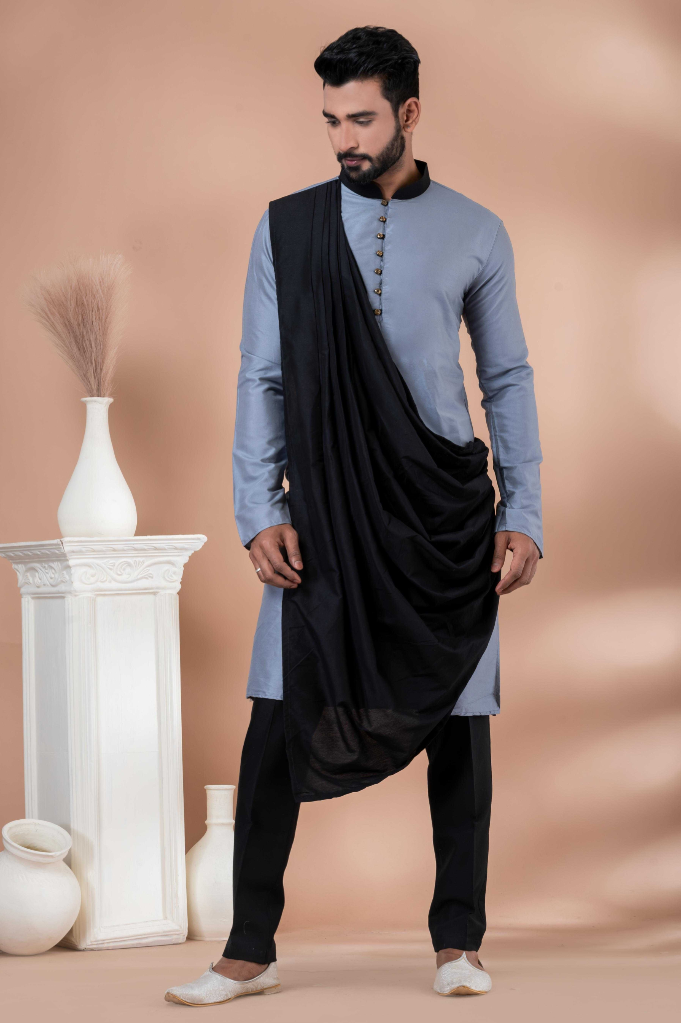 Add a touch of sophistication to your ethnic wardrobe with this premium viscose kurta set, styled with a contemporary draped stole for a regal finish. The contrasting black stole paired with the elegant pastel kurta makes it a standout choice for weddings, festive occasions, and cultural gatherings.