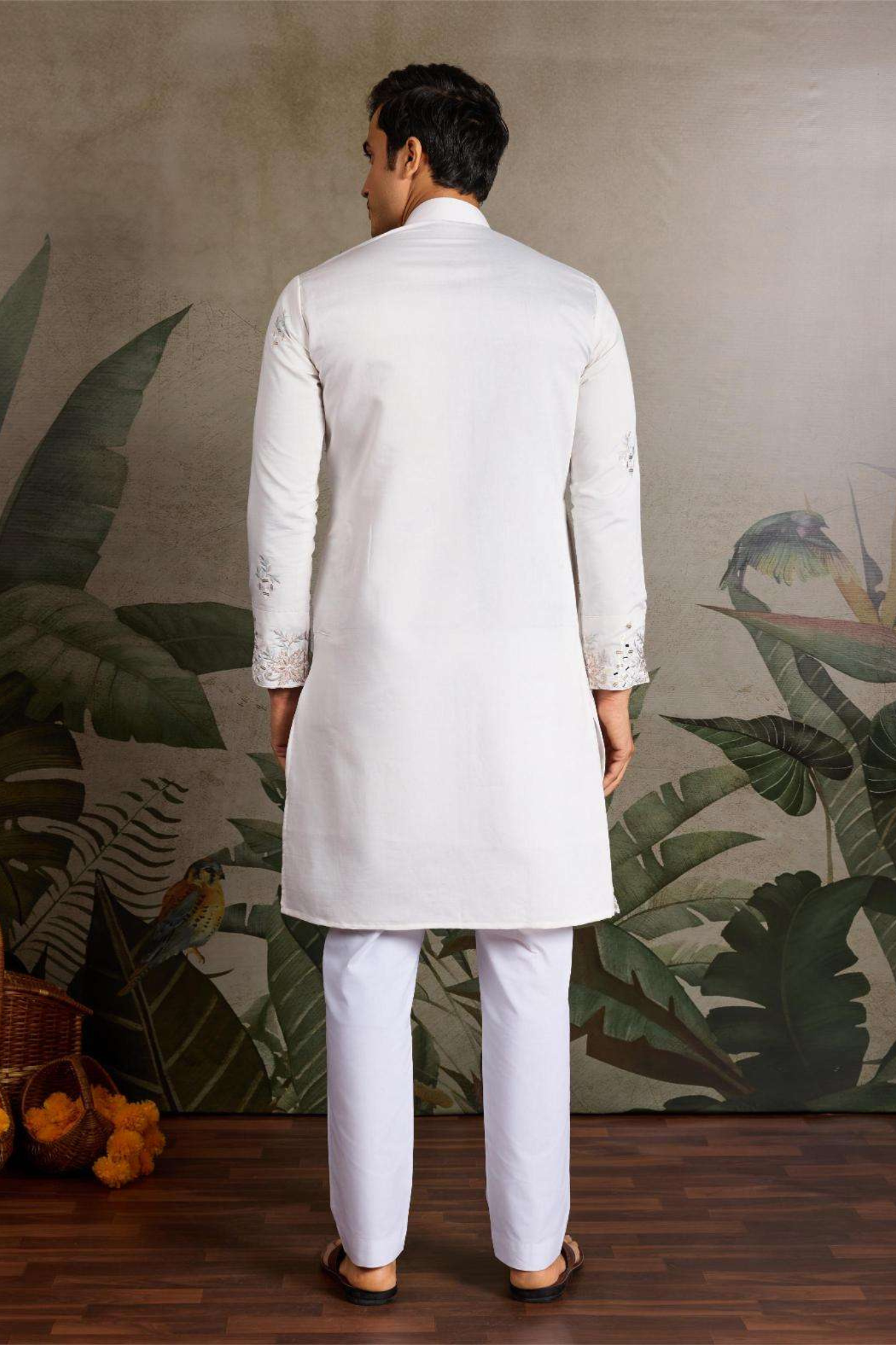This White Kurta Set is crafted for elegance and grandeur, featuring exquisite embroidery in floral patterns on the front side and sleeves with lace work (0.8 MTR) and detailed embroidery on the back side with sleeves (1.1 MTR). Paired with a crisp white pant, this outfit brings a perfect balance of regal style and modern sophistication.