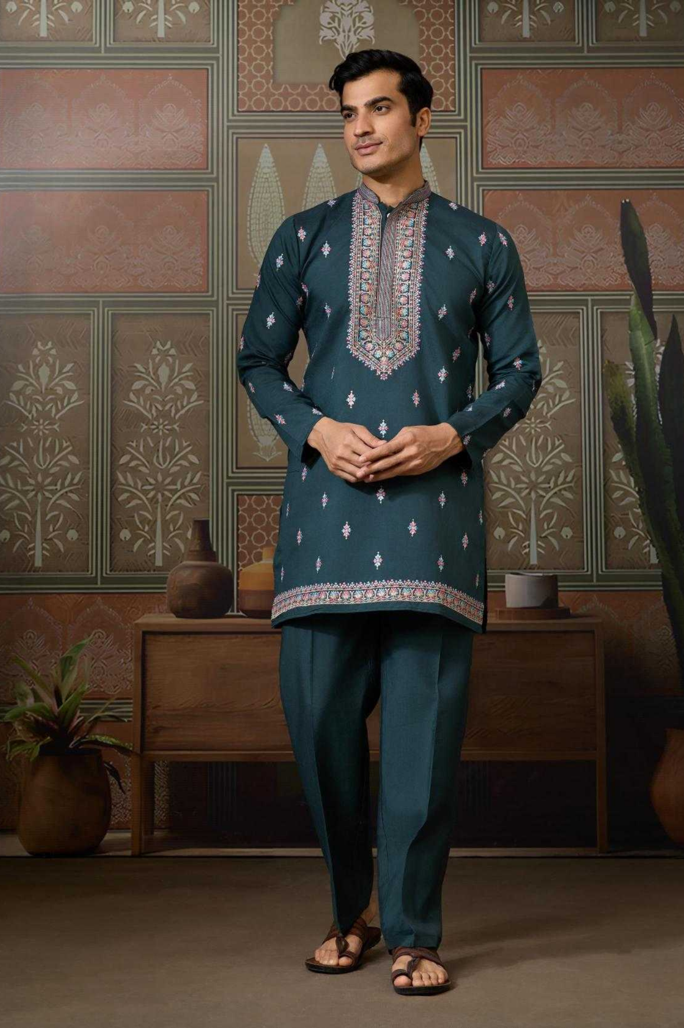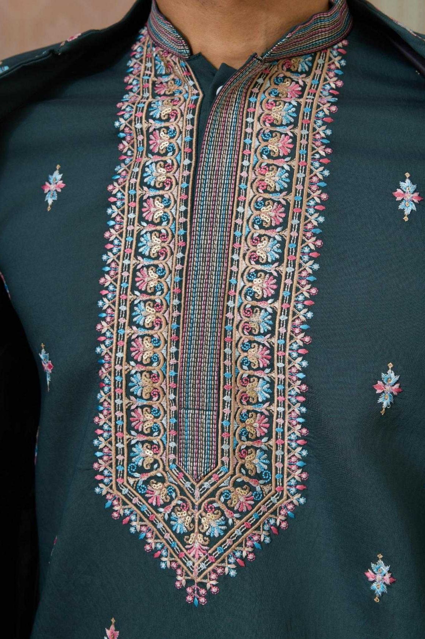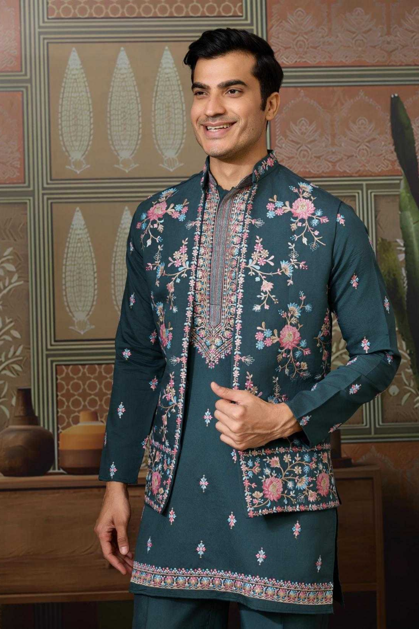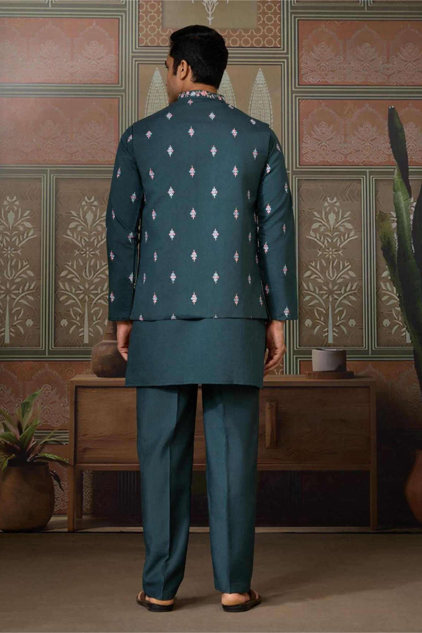 A regal 3-piece men’s ethnic set crafted for festive elegance. The kurta is designed in rich navy blue fabric, detailed...