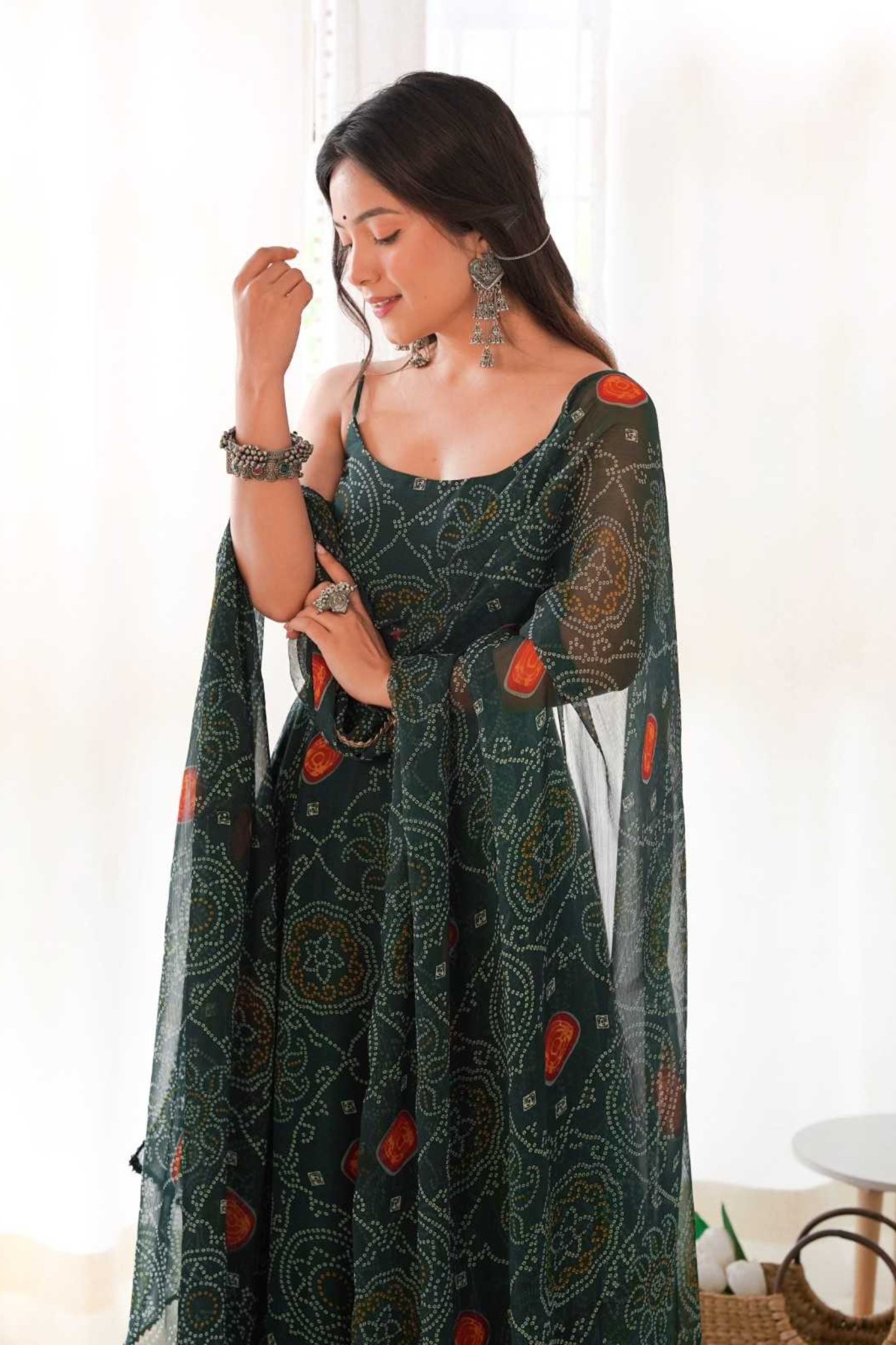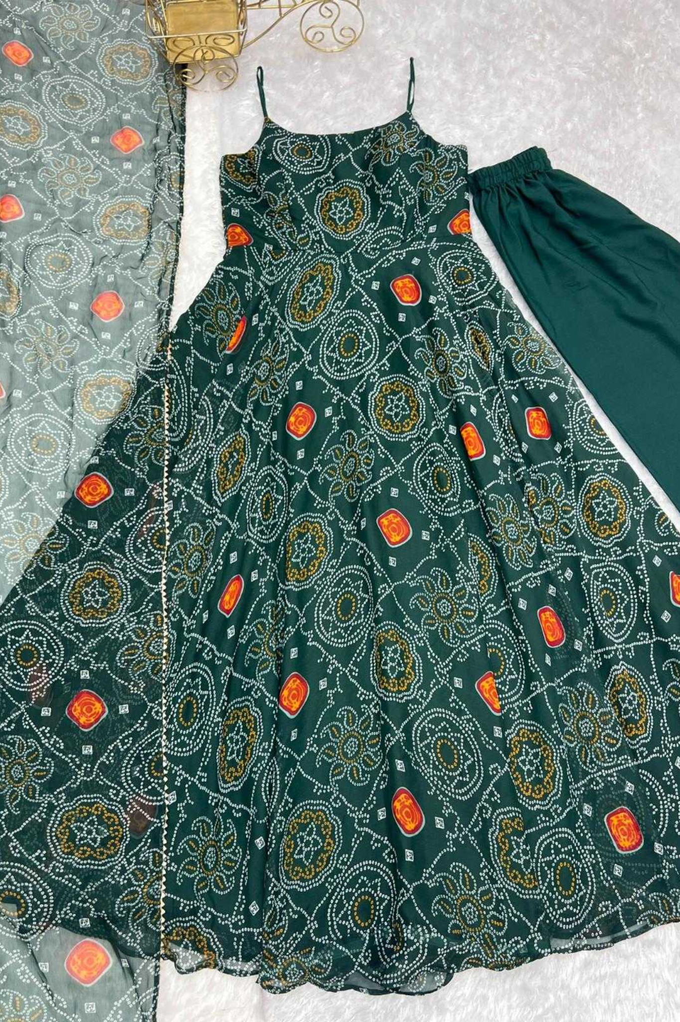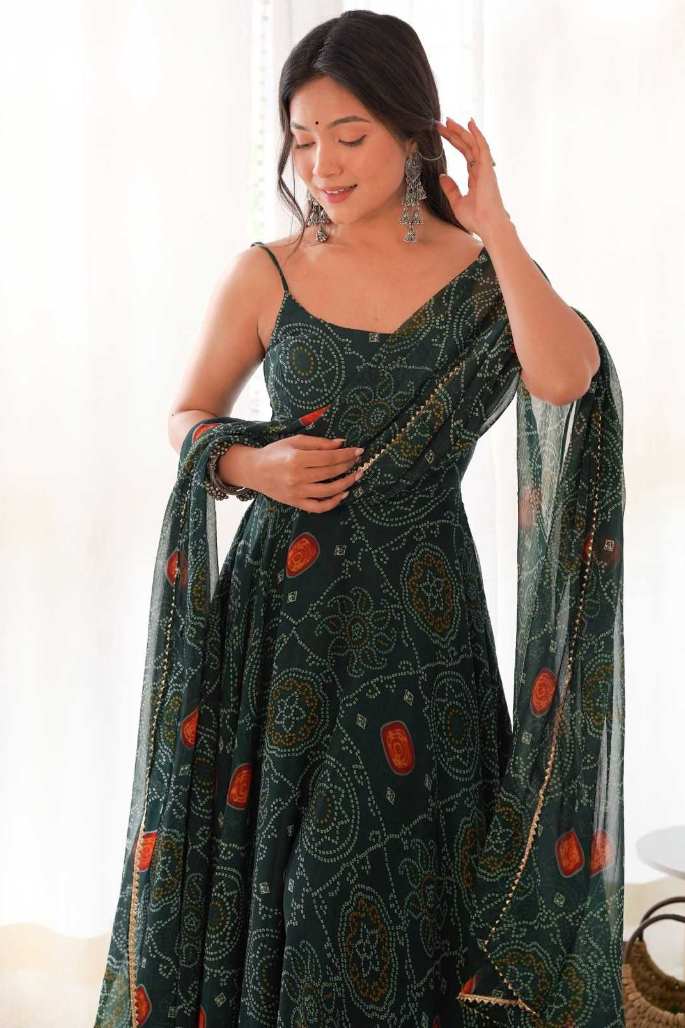 Emerald Green Chiffon Bandhej Anarkali with Dupatta