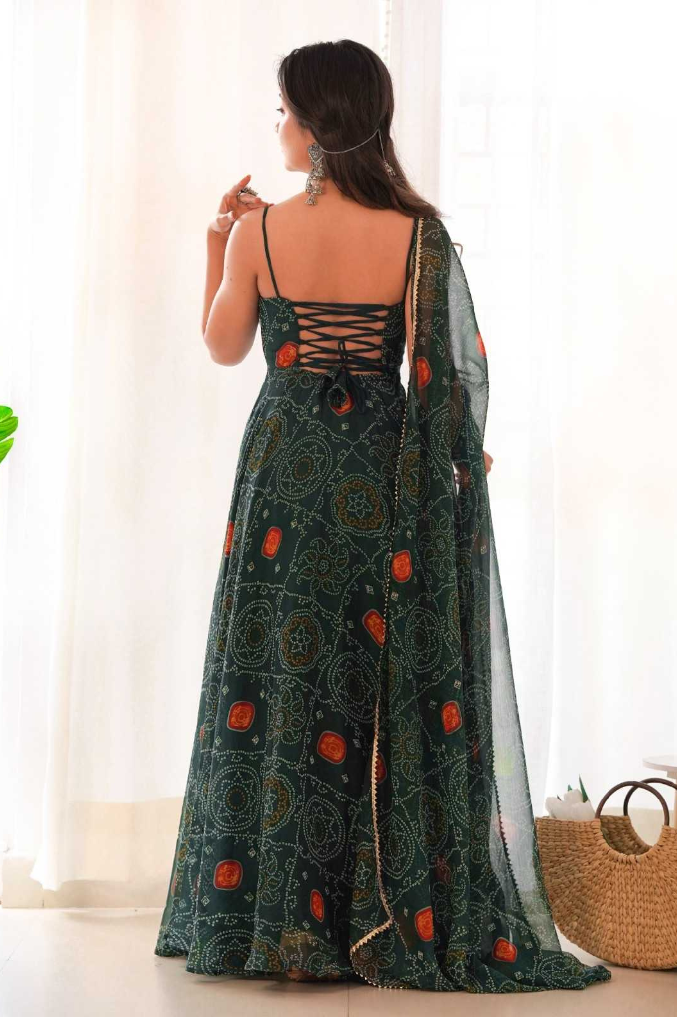 Step into effortless elegance with this emerald green Bandhej Anarkali gown, crafted from pure soft lightweight chiffon with a full 8-meter flair that flows gracefully. Designed in a 54–55 inch length, it features a padded bodice and fancy backless dori pattern, making it both stylish and comfortable. The gown comes with a micro cotton full inner for added comfort.