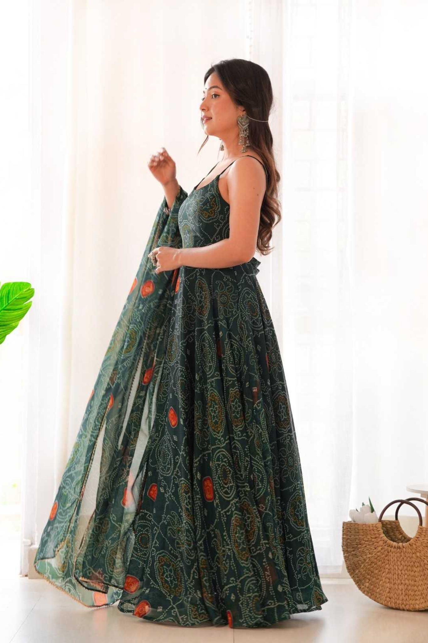 Step into effortless elegance with this emerald green Bandhej Anarkali gown, crafted from pure soft lightweight chiffon with a full...