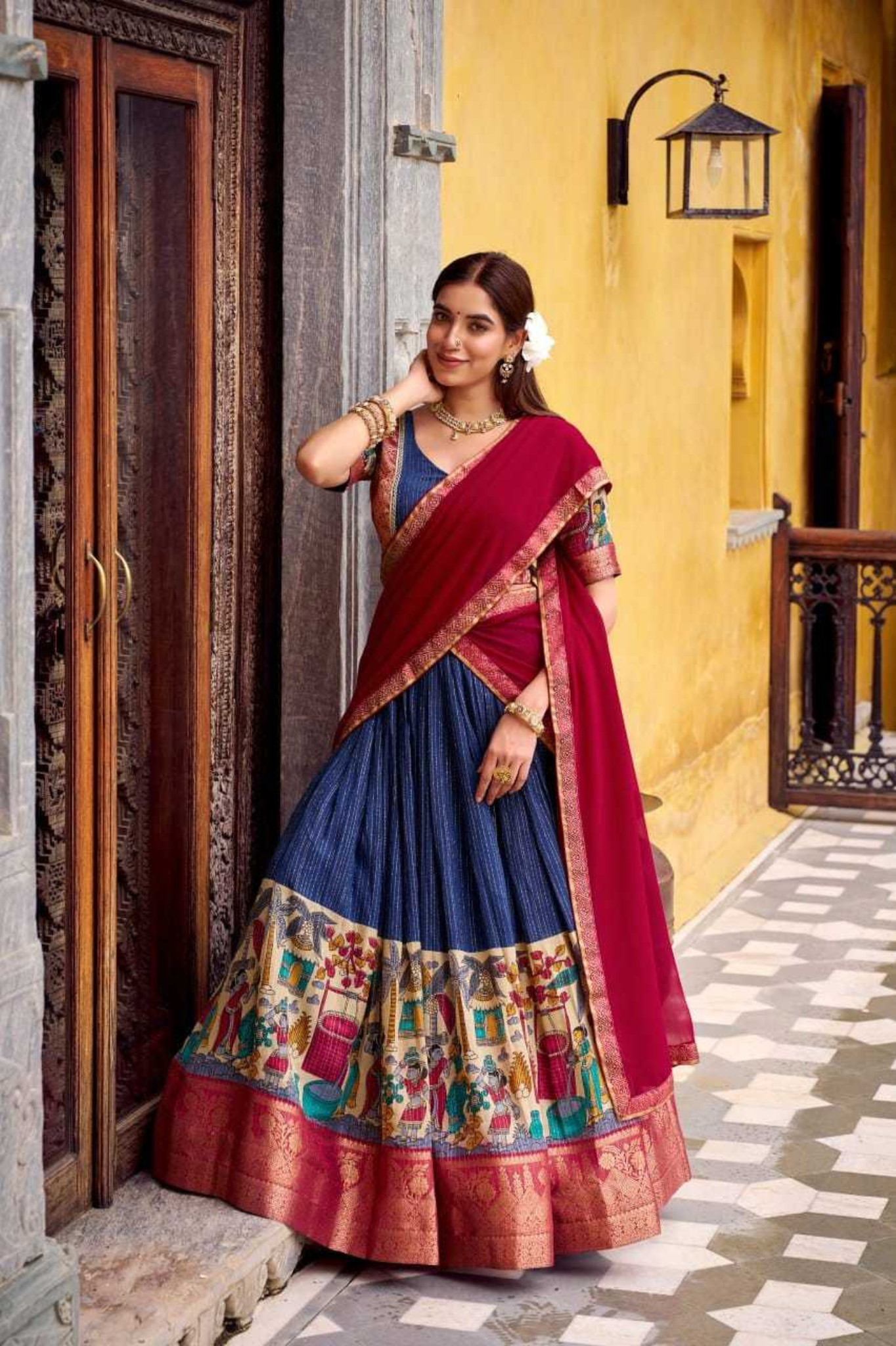 Radiate festive elegance with this stunning Poly Chanderi Lehenga Set crafted in rich zari stripe fabric and adorned with traditional Kalamkari print and zari weaving work. The lehenga is stitched with canvas support for structure and comes with a micro cotton inner for all-day comfort.