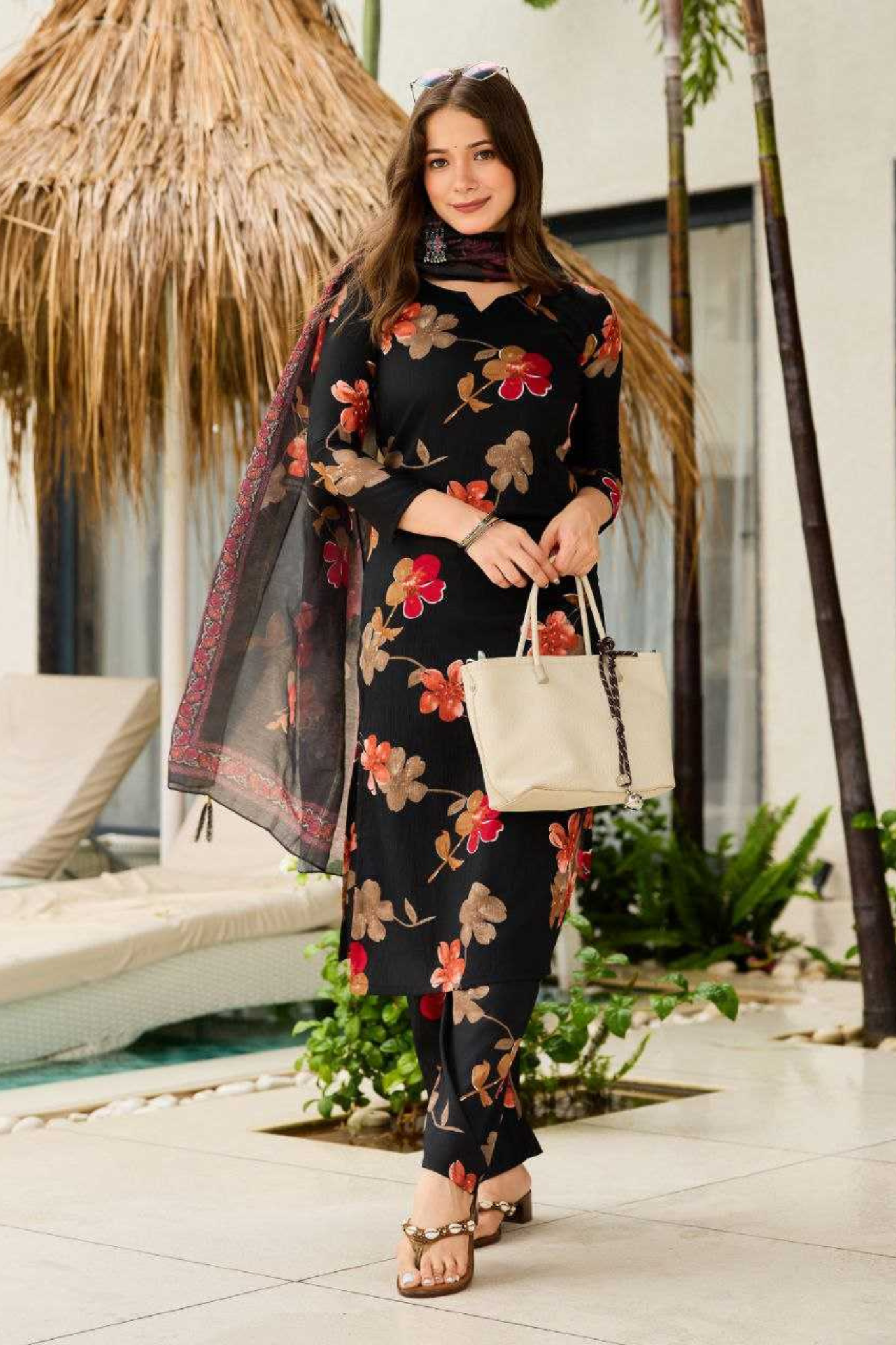 A stunning silk blend suit set with rich floral prints and a touch of elegance. Perfect for festive gatherings and...
