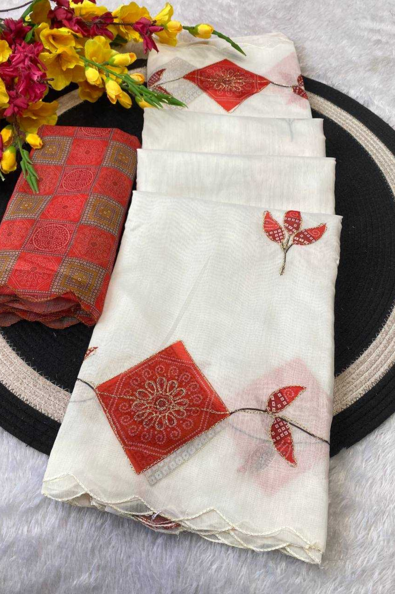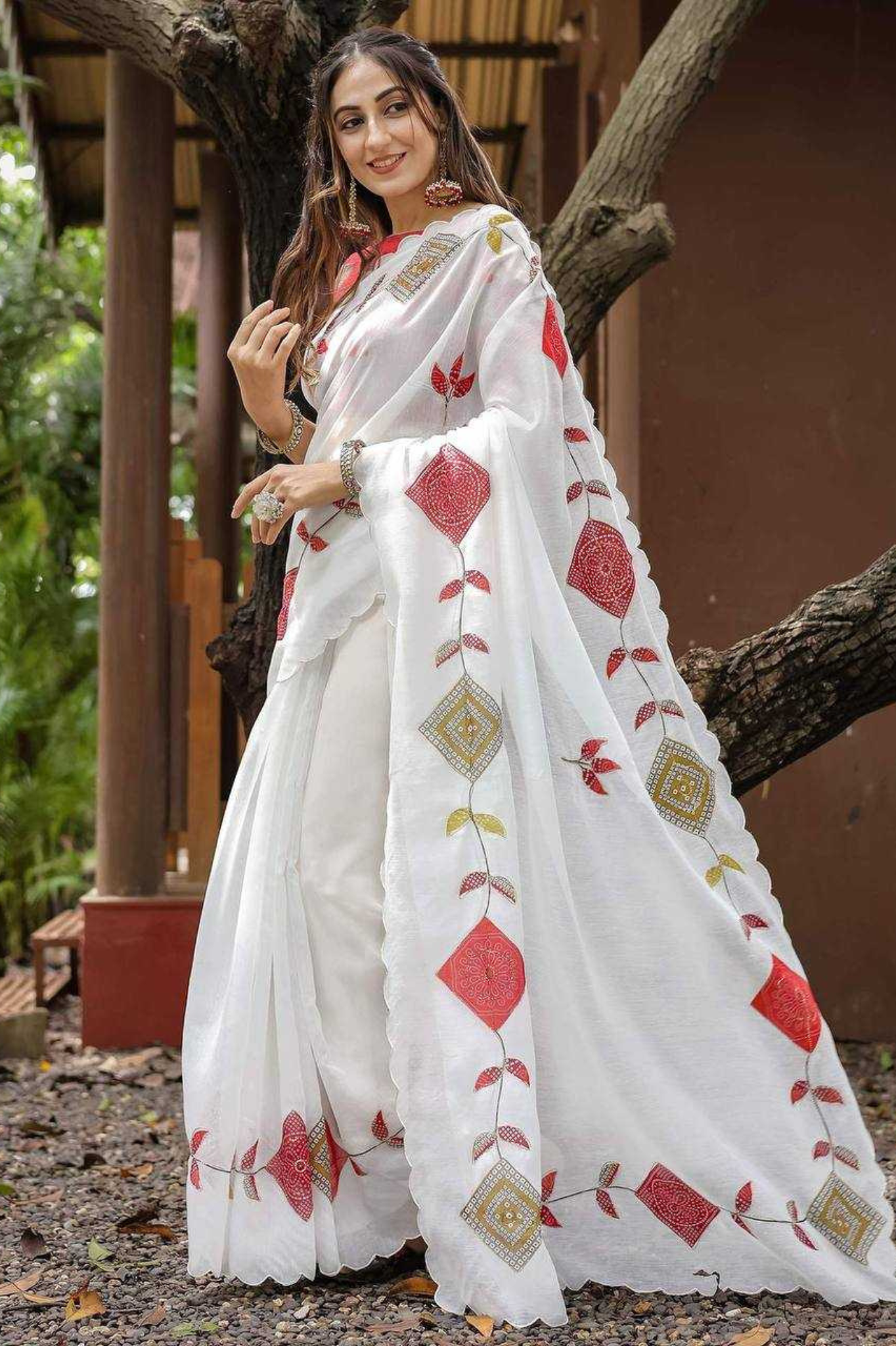 An elegant drape crafted from premium crunchy chiffon, this saree features a graceful scallop design with fine thread embroidery work, making it a timeless addition to your festive and wedding wardrobe. The satin digital print blouse complements the saree beautifully, adding a modern touch...