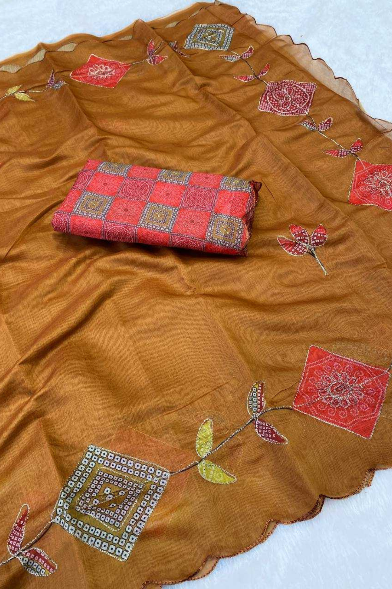 An elegant drape crafted from premium crunchy chiffon, this saree features a graceful scallop design with fine thread embroidery work, making it a timeless addition to your festive and wedding wardrobe. The satin digital print blouse complements the saree beautifully, adding a modern touch...