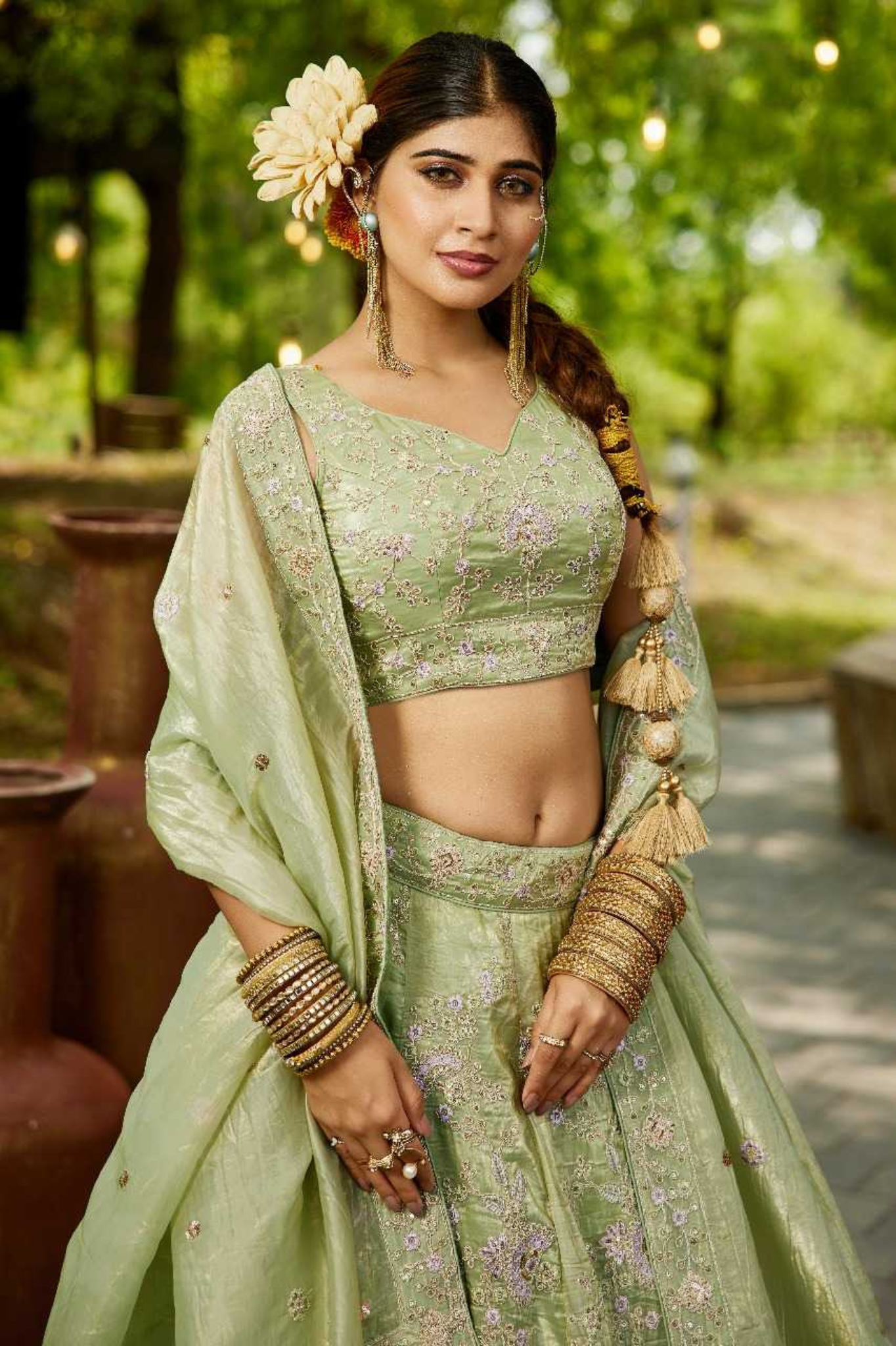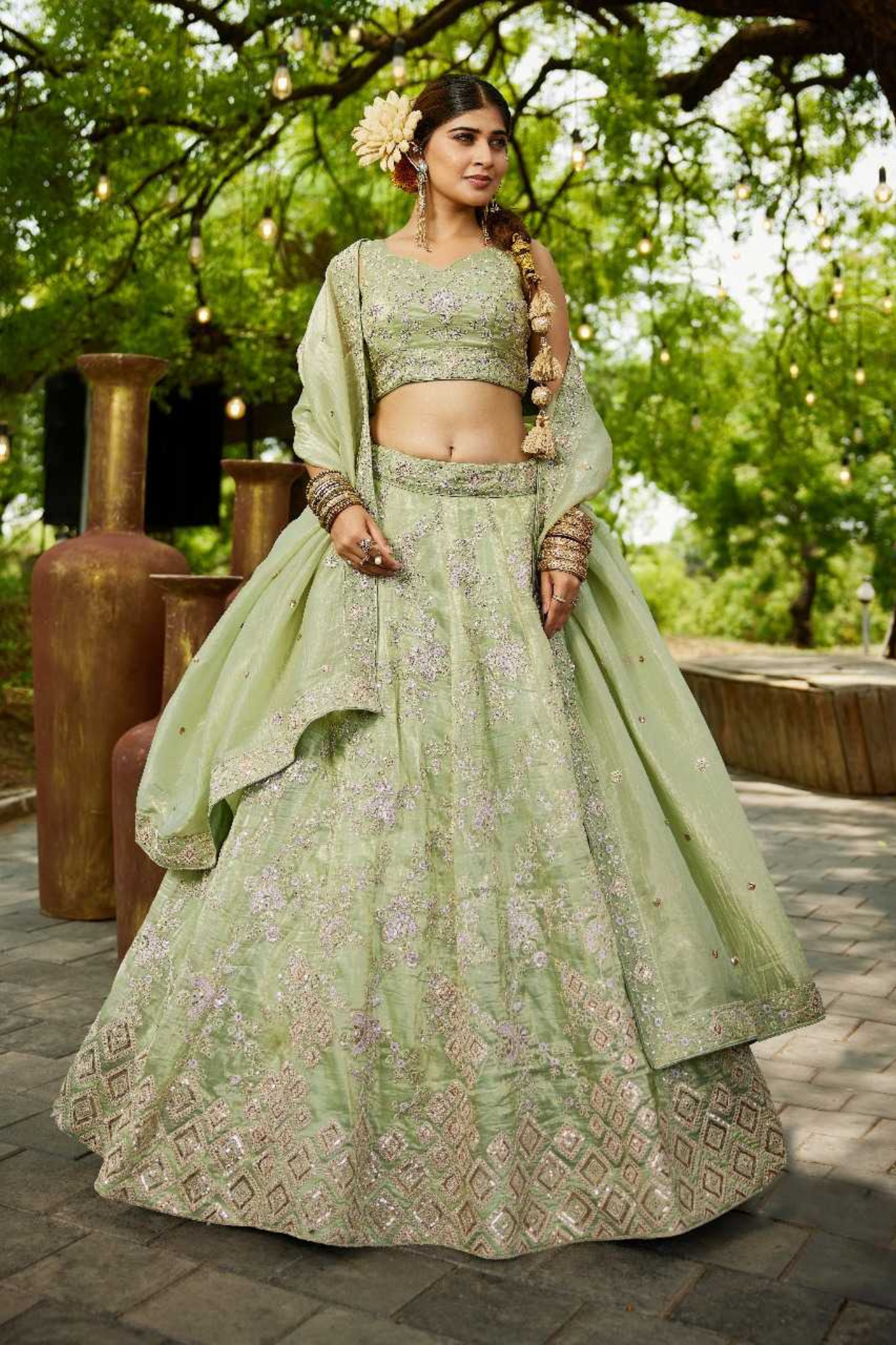 Pastel Green Tissue Embroidered Bridal Lehenga Choli with Dupatta