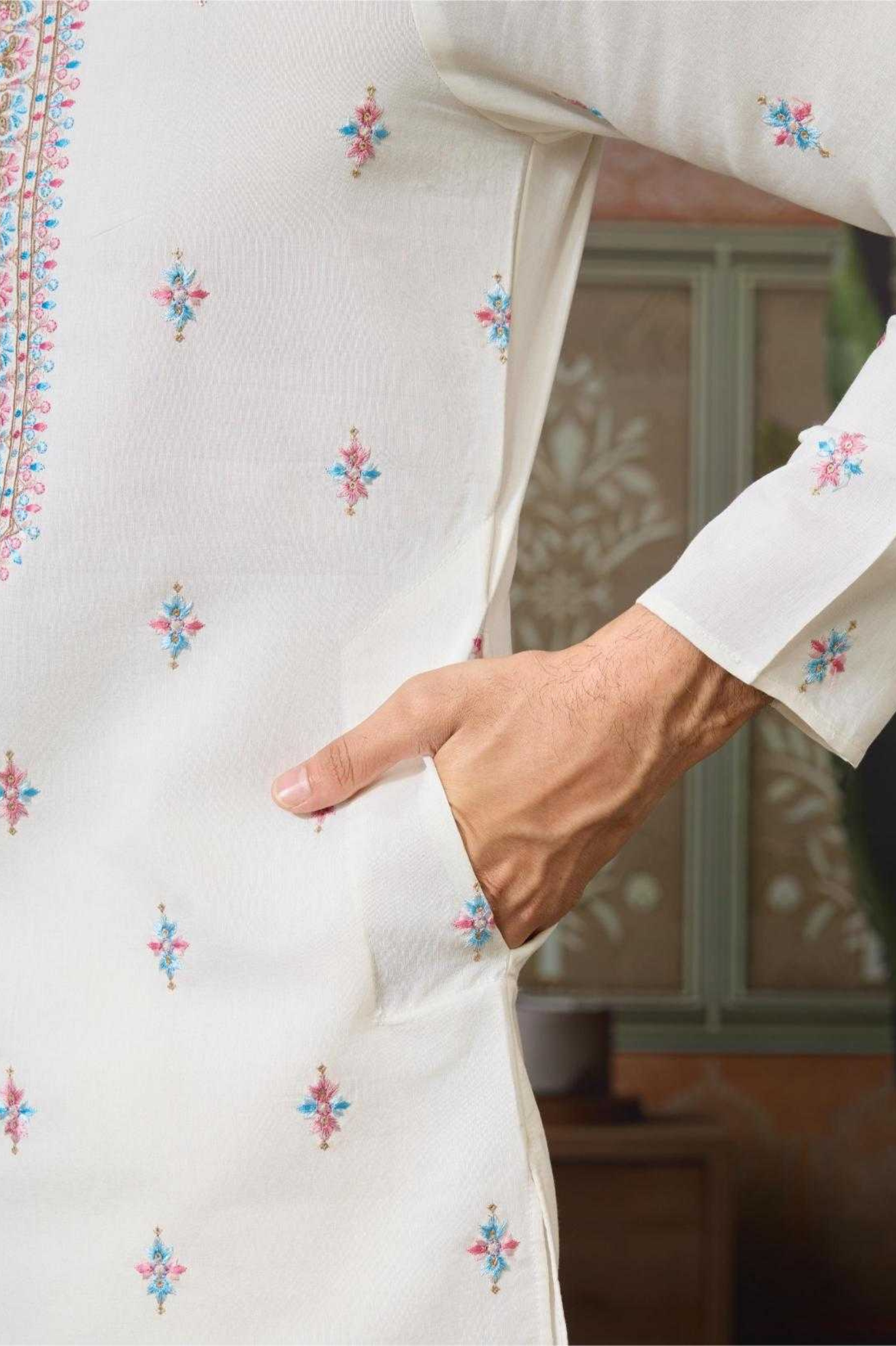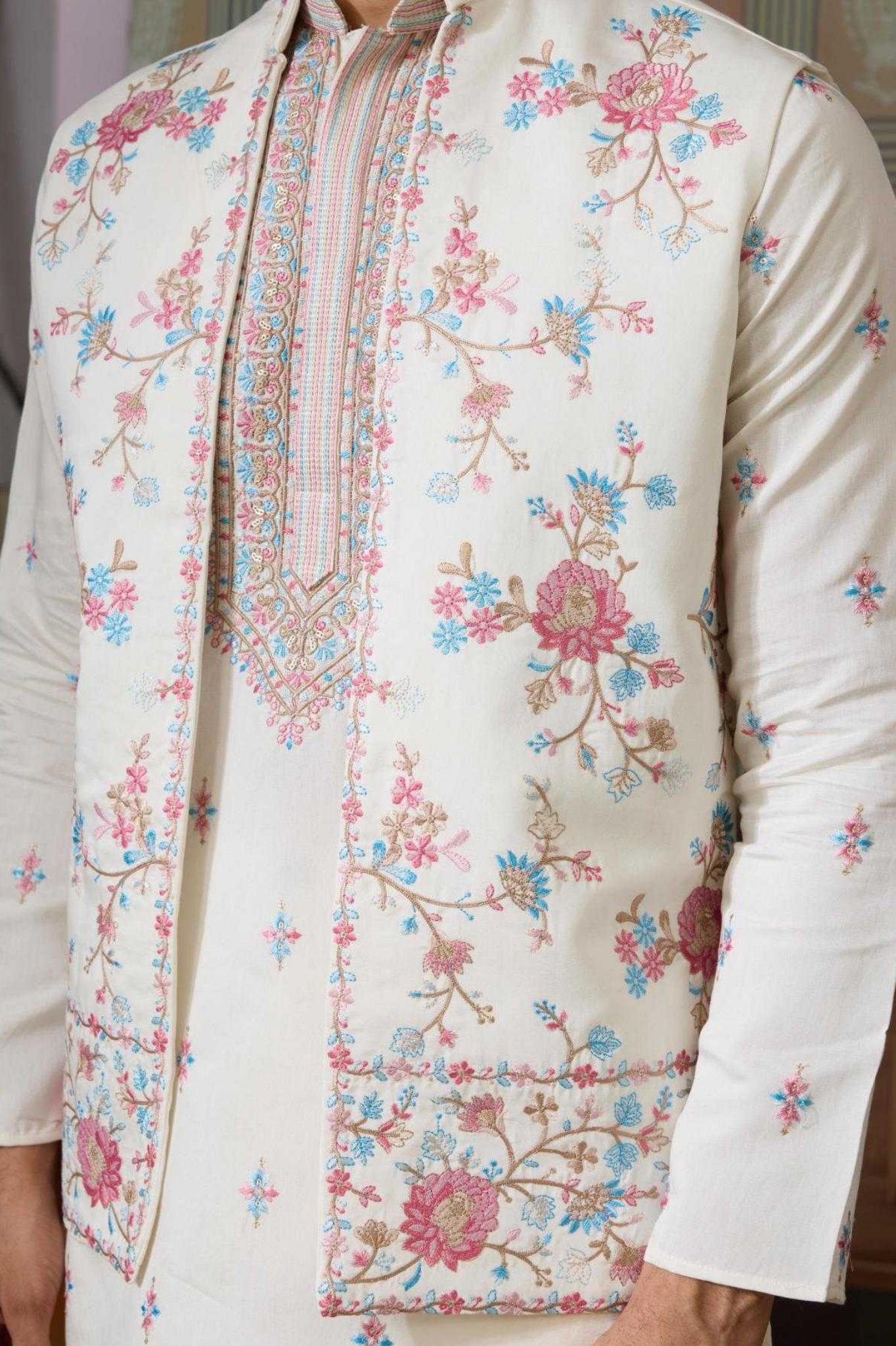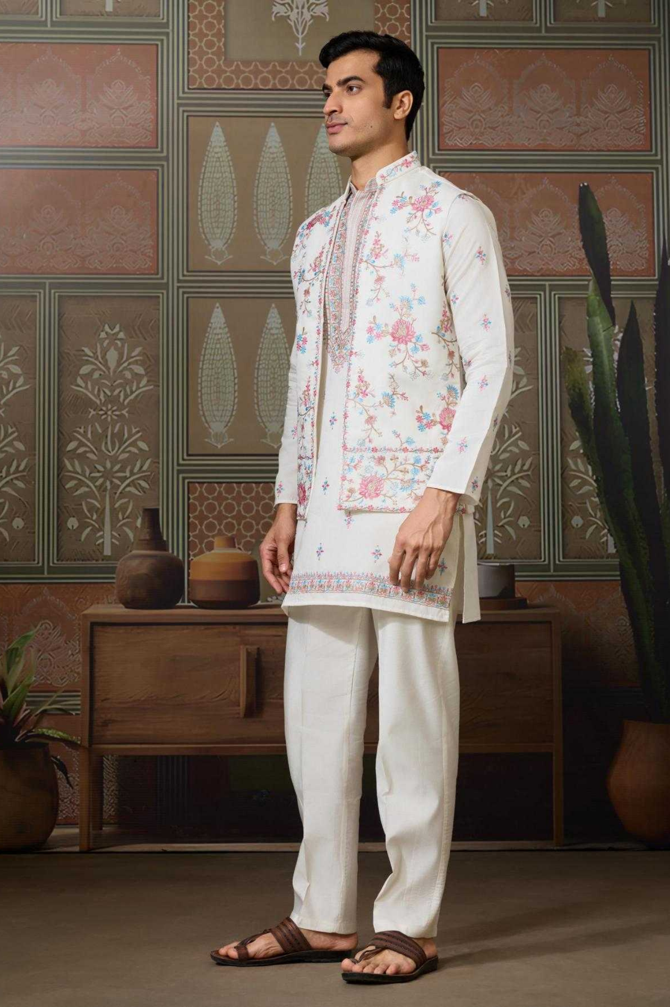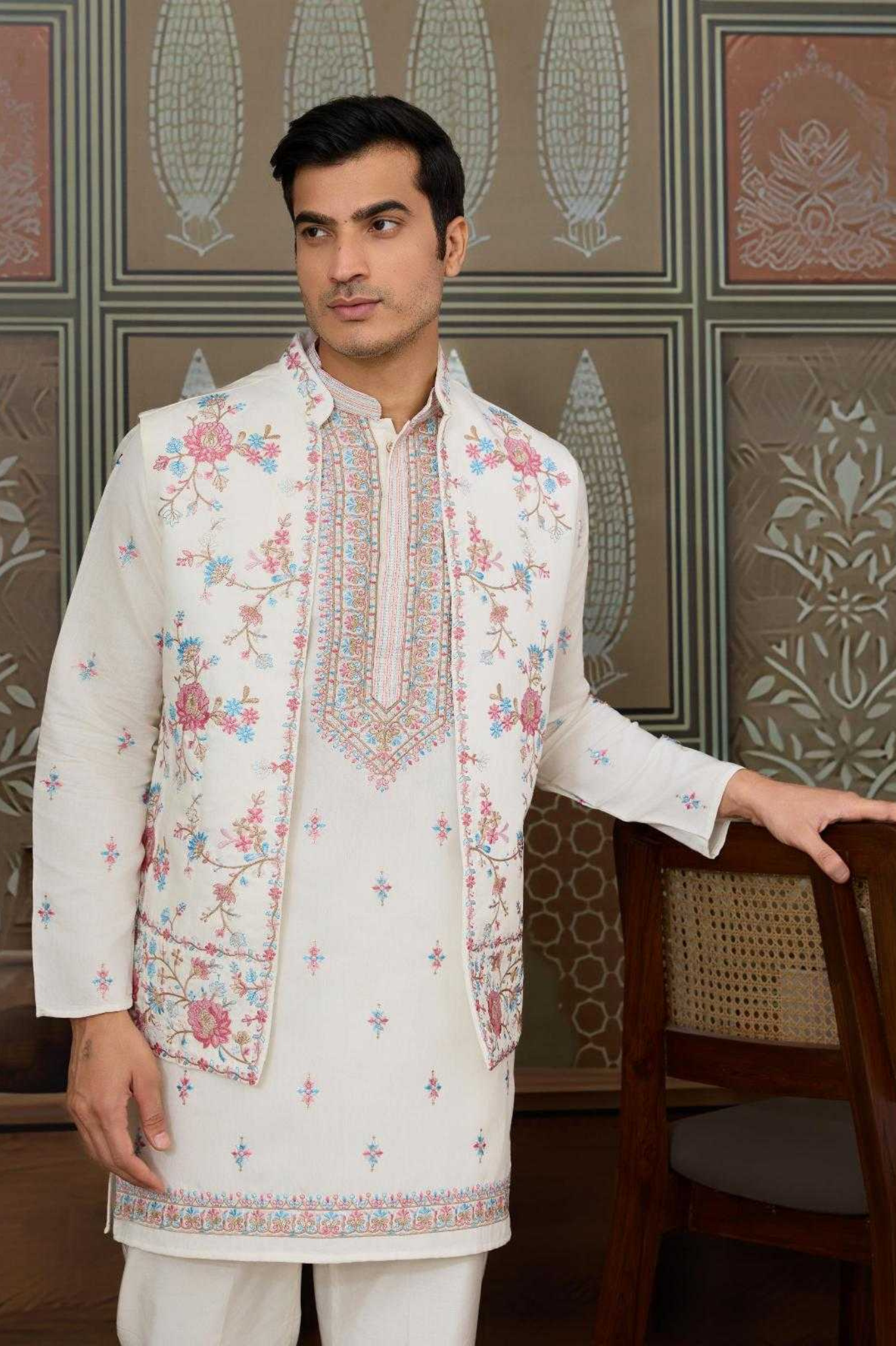 A regal 3-piece men’s ethnic set crafted for festive elegance. The kurta is designed in rich navy blue fabric, detailed...