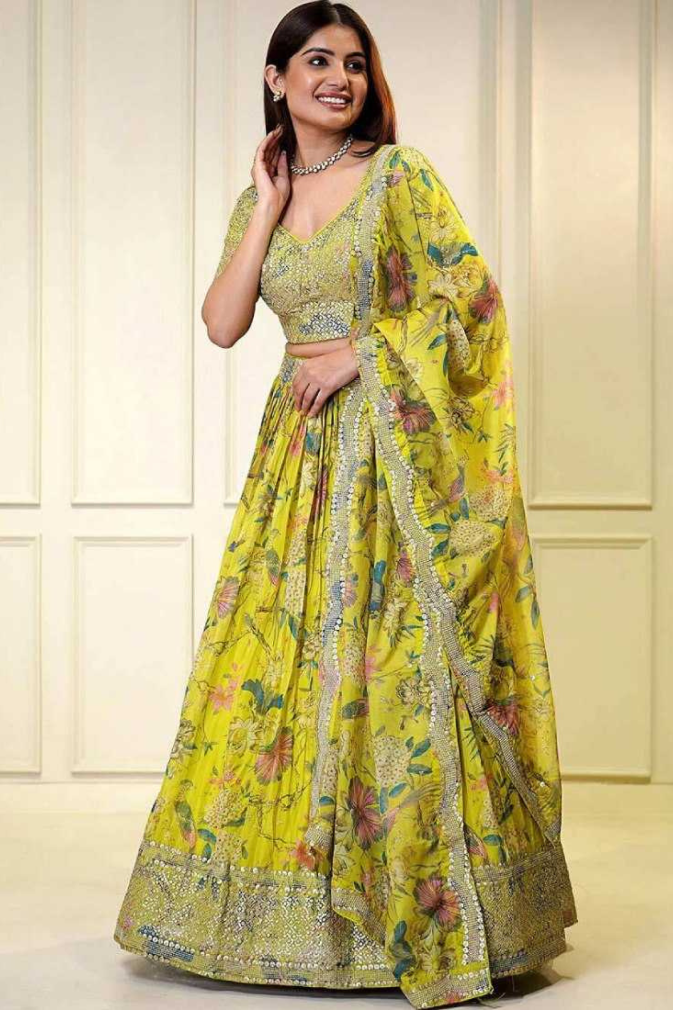 This stunning floral lehenga choli set crafted in premium organza fabric is a perfect blend of elegance and festive charm. The lehenga features vibrant floral prints highlighted with delicate mirror and sequin accents, paired with a beautifully embroidered organza blouse. The matching organza dupatta with embellished border completes this graceful ensemble, making it ideal for weddings, festive gatherings, and special occasions.