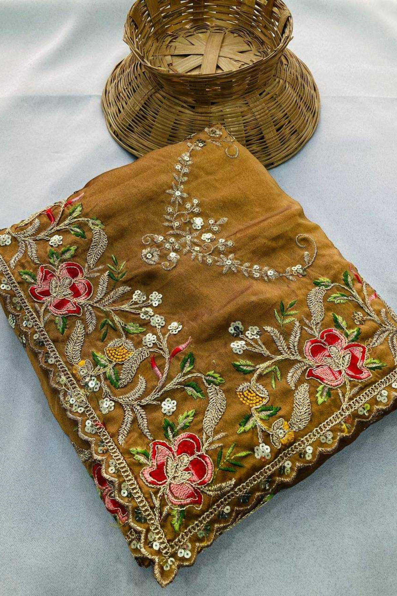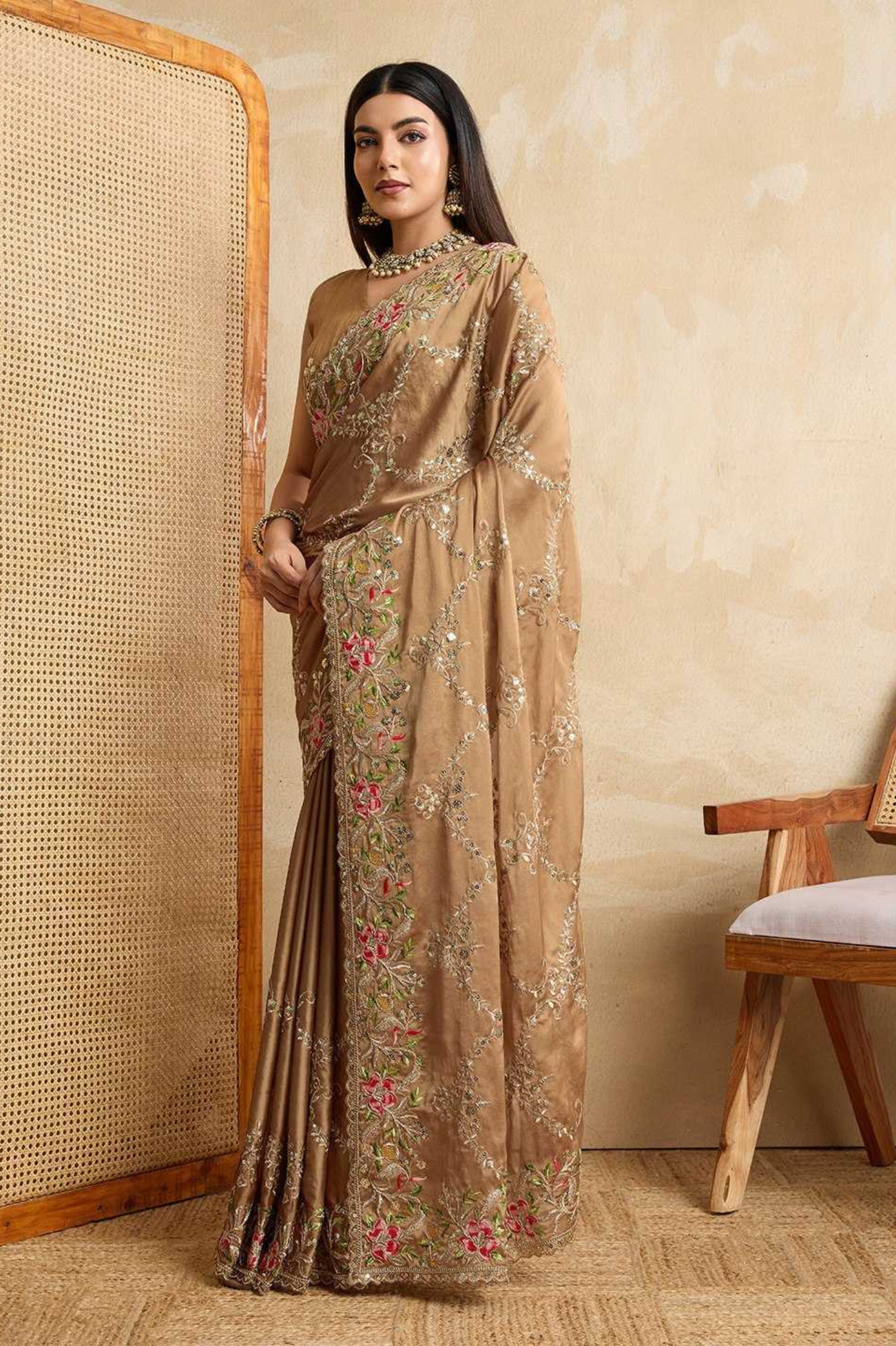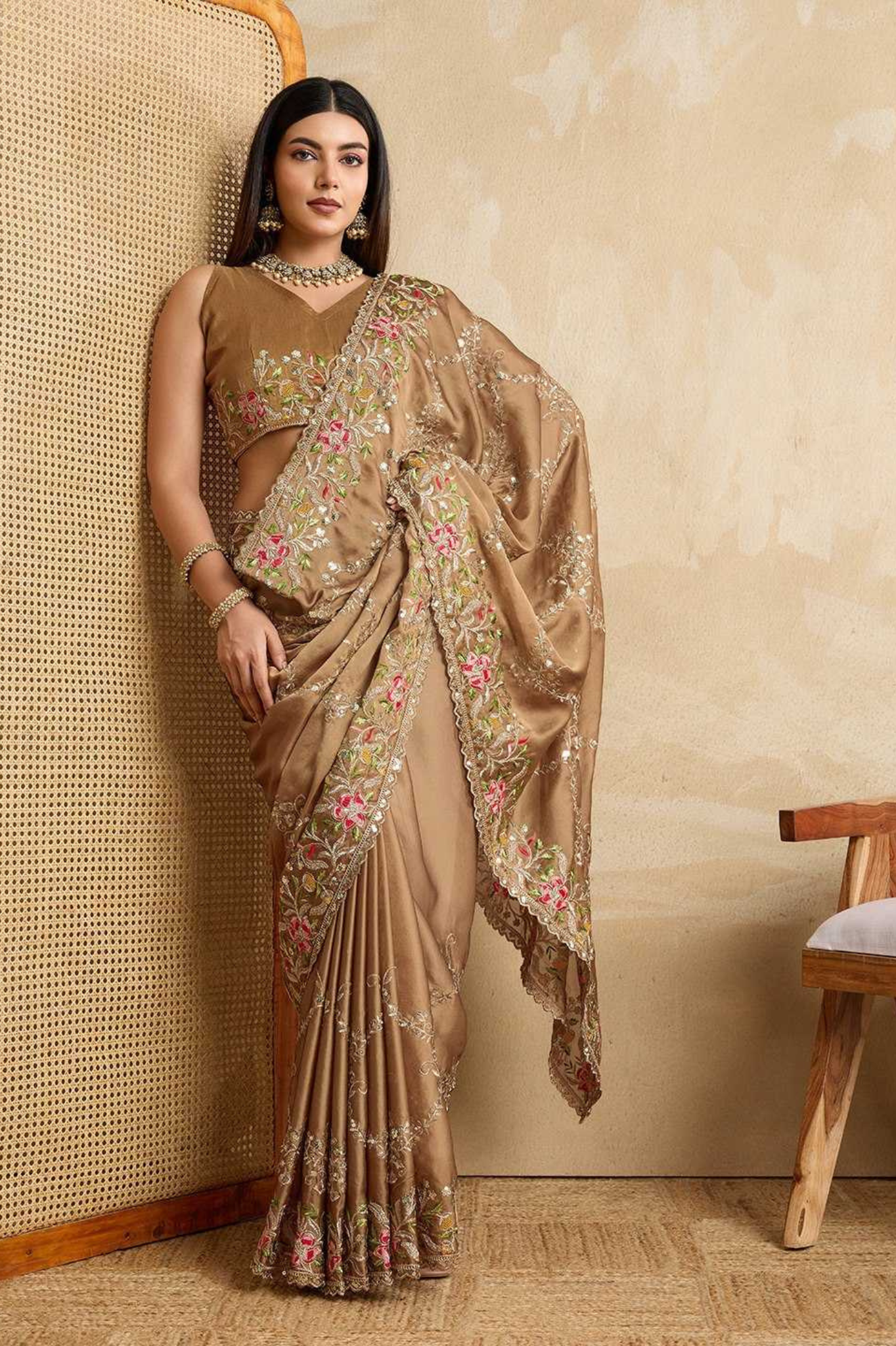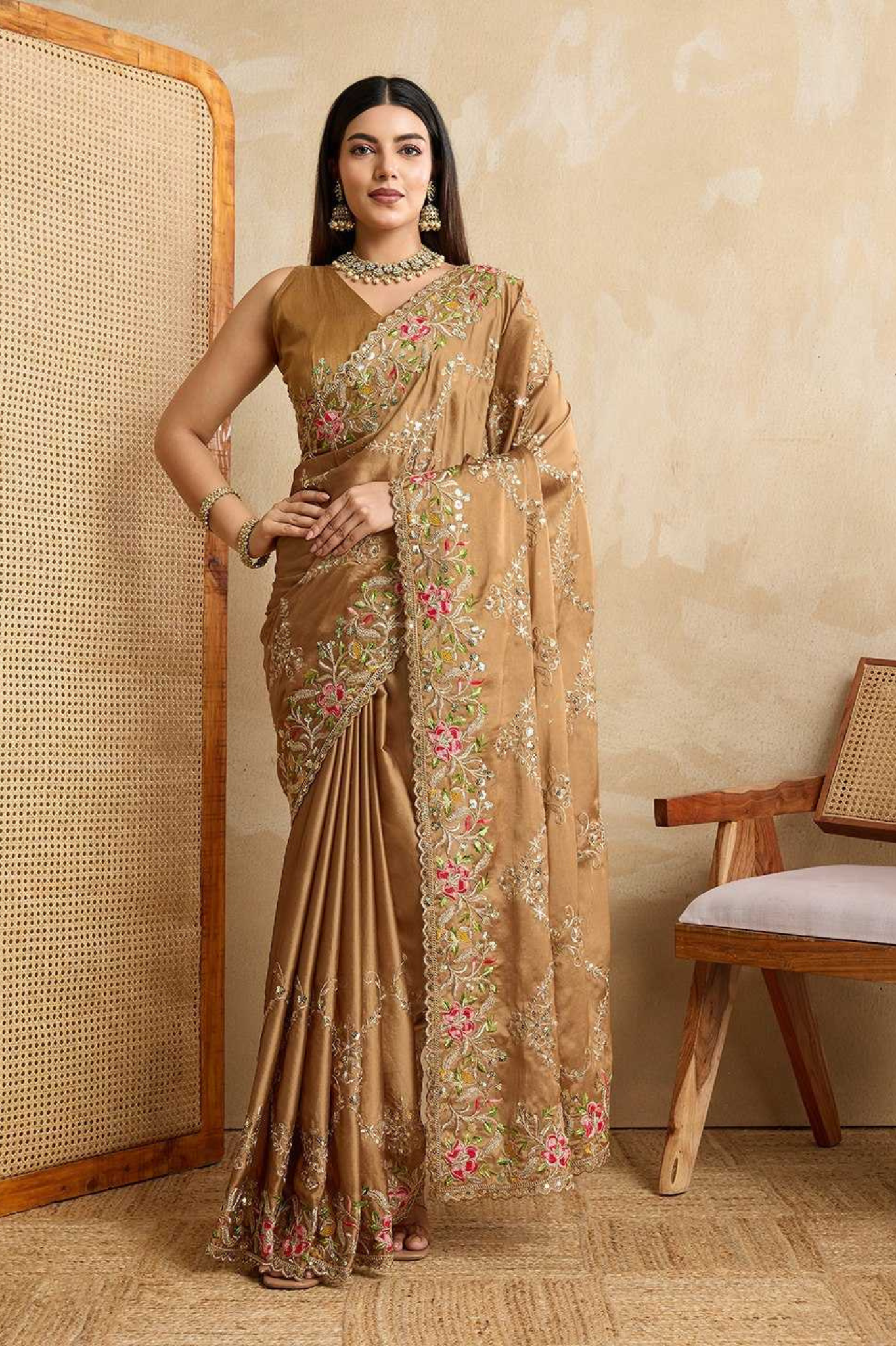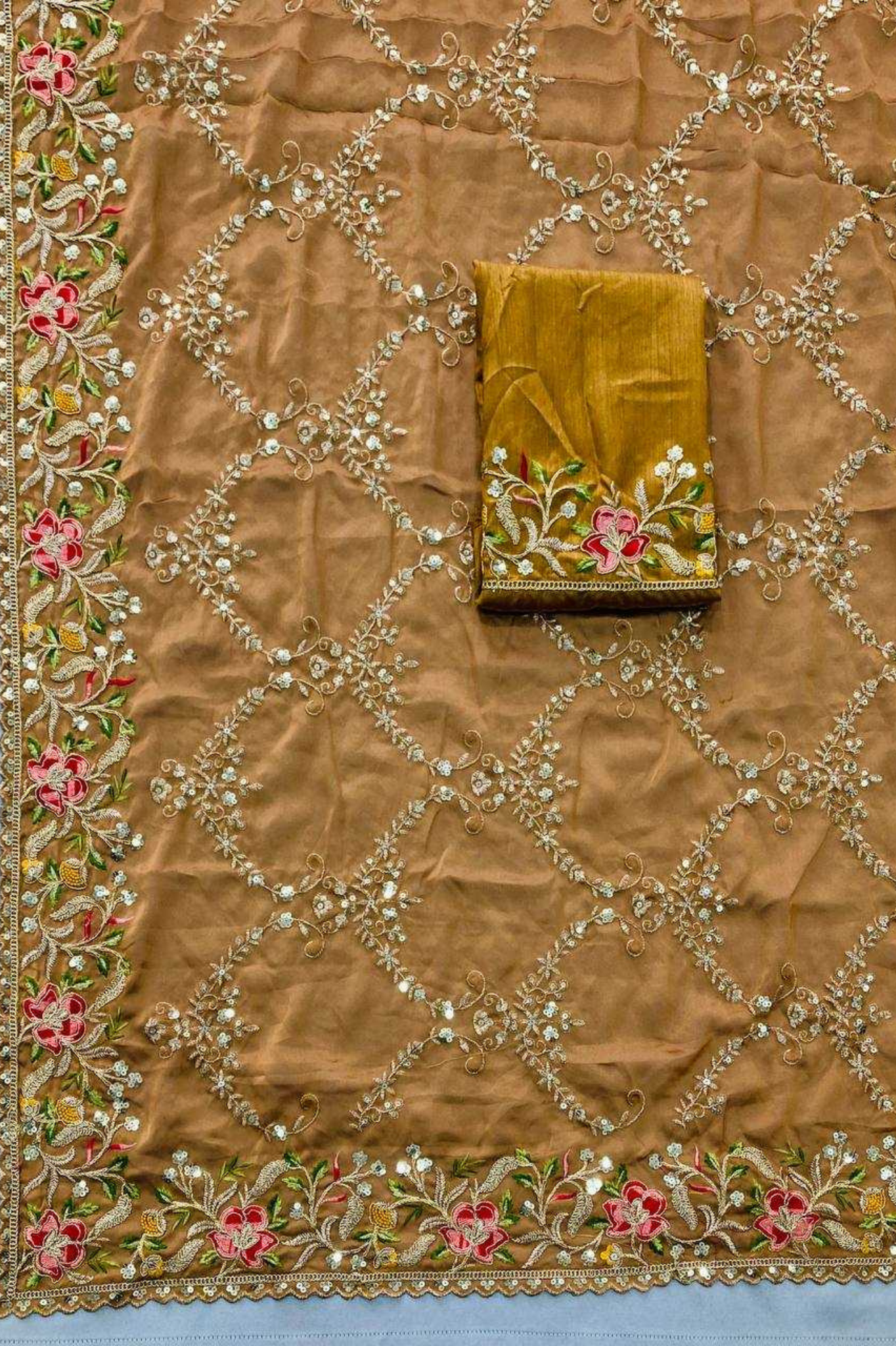 Shine with elegance in this golden saree crafted from heavy smooth gold crush fabric. The drape is beautifully adorned with designer moti and zigzag striped sequin embroidery work all over, giving it a rich and festive appeal. Paired with a heavy mono Banglori plain...