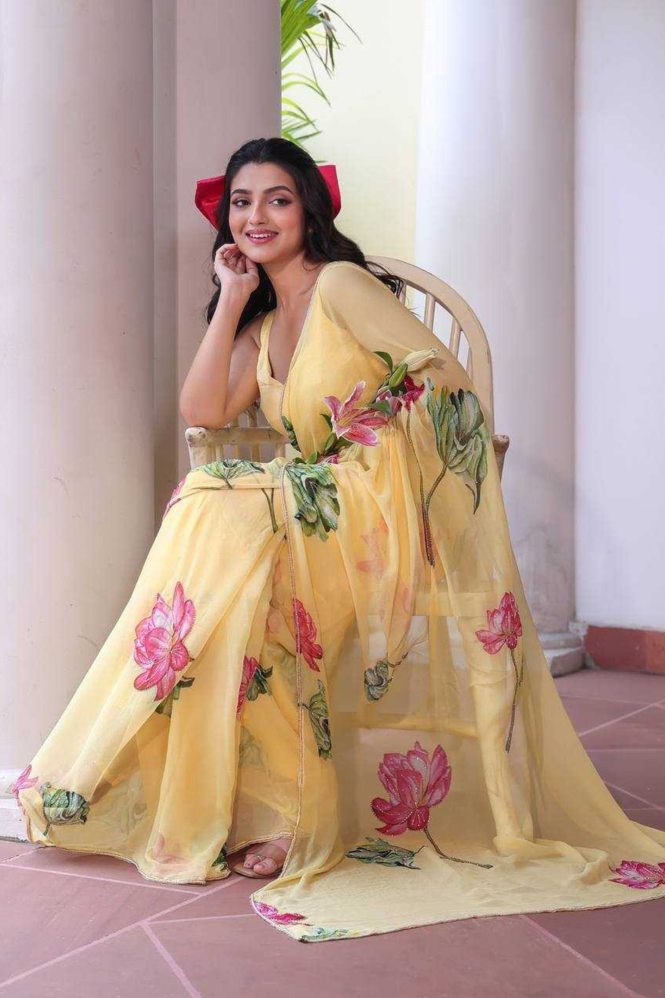 Exuding effortless grace and sophistication, this Soft Tabby Silk Saree captures the beauty of delicate florals paired with fine hand embellishments — perfect for festive occasions and elegant gatherings.