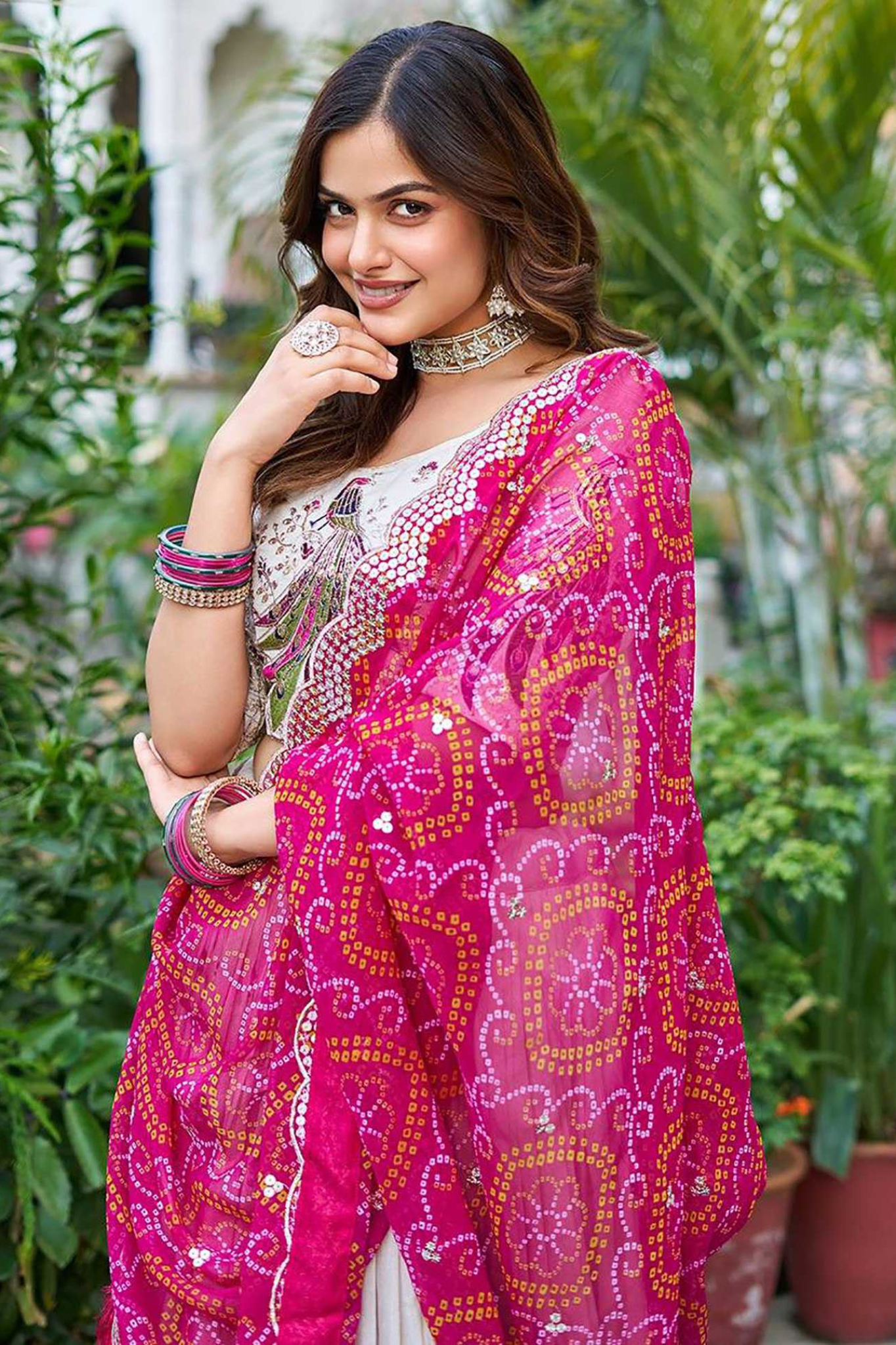 White Chinon Embroidered Peacock Lehenga with Pink Georgette Dupatta