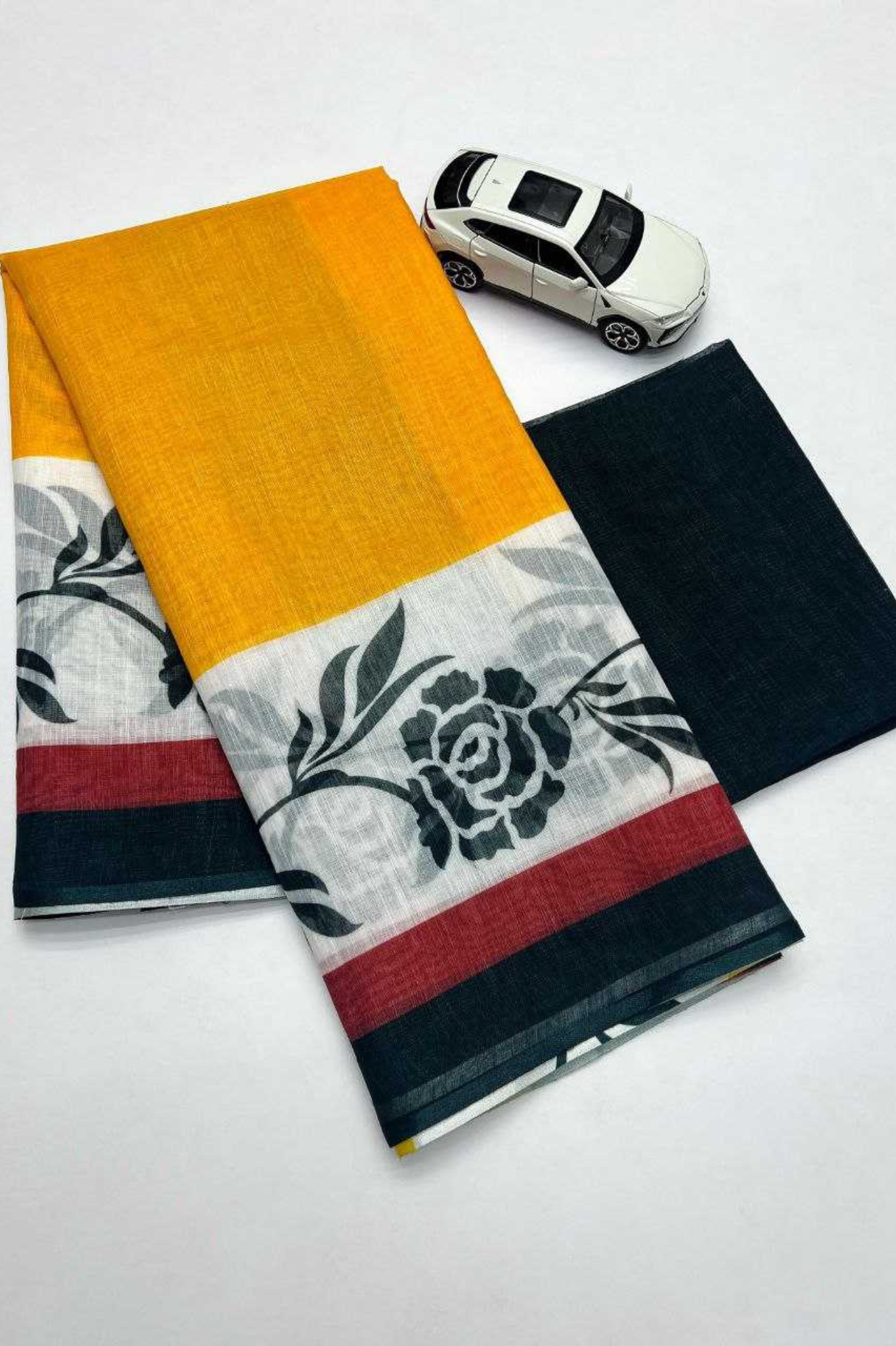 Add a bold yet elegant touch to your wardrobe with this linen saree featuring striking digital prints in floral and geometric patterns. The vibrant combination of yellow, black, red, and white makes it a standout piece for festive gatherings and casual outings. Enhanced with latkan (fumka) details, it offers a modern twist to traditional wear. Paired with a Banglory satin blouse, this saree ensures both comfort and style.